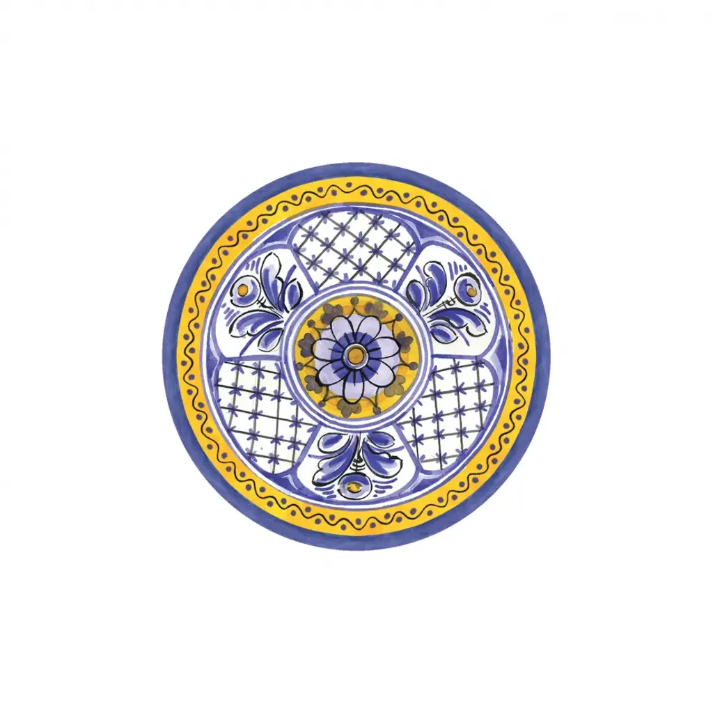 Intricate geometries masterfully handpainted in dark blue and orange make this majolica wall plate a show stopper. Combine it with other plates from the same Renaissance collection to create an original and elegant wall decor.