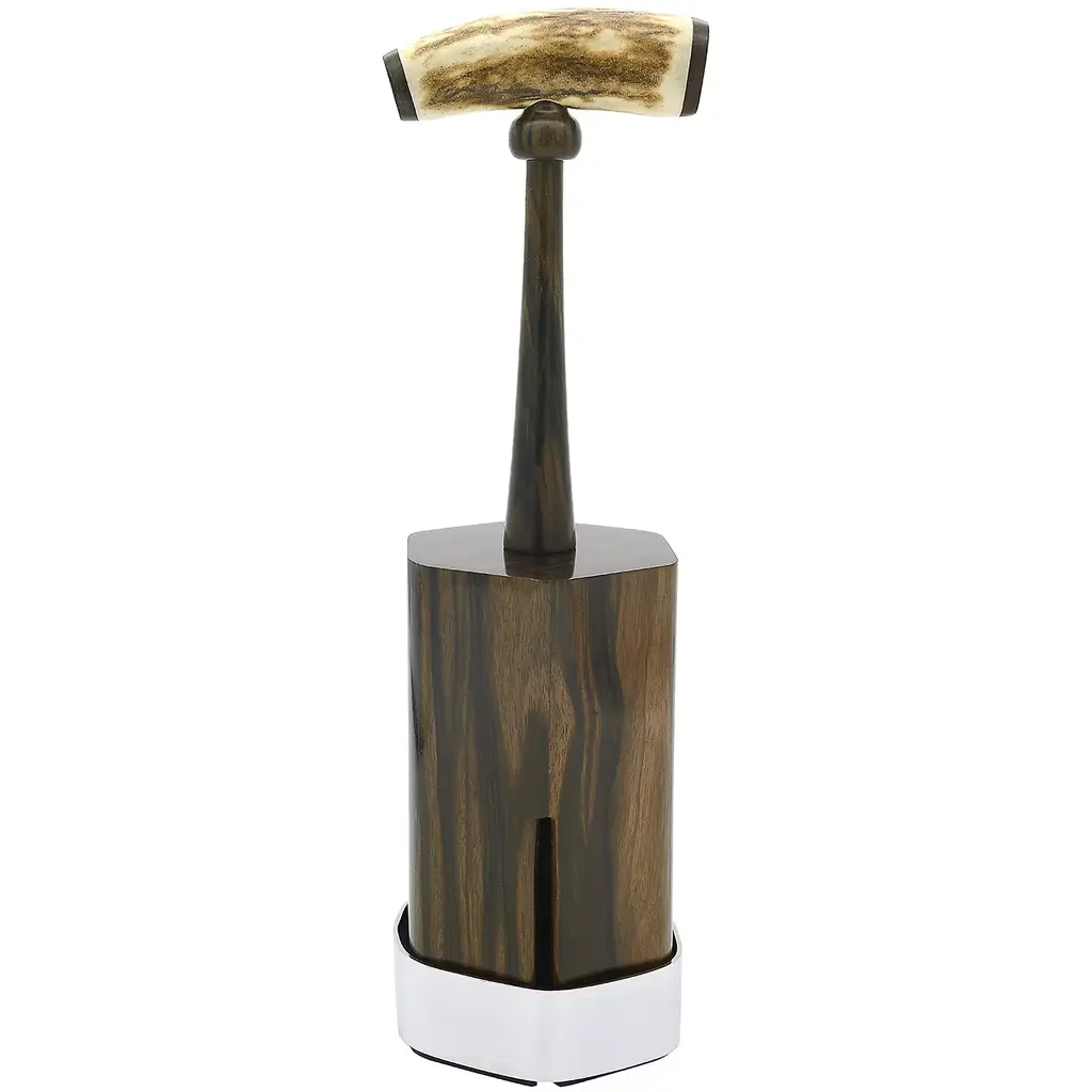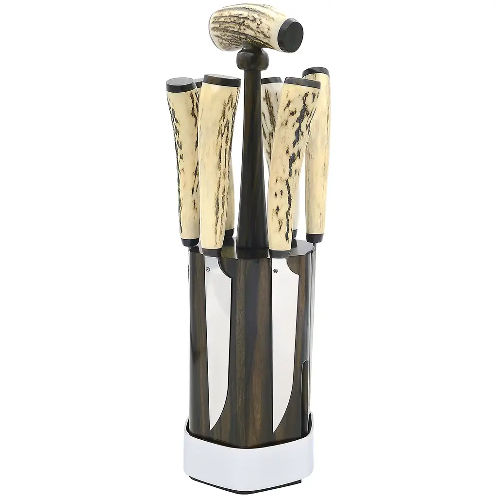 This magnetic wood knife block comes with six high-quality steak knives, handcrafted by Roberto Ottonello. Its solid Makassar ebony base is topped with a genuine deer horn handle to match the handles of the knives, exuding a refined yet rustic allure. The handle features a knife locking system for safe and easy transportation.