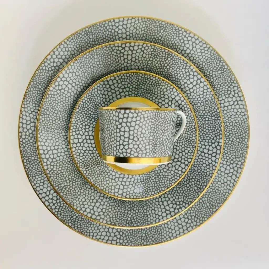 The Recamier shape takes on a contemporary flair with Makassar, rendering elegant sharkskin in gray with handpainted 24k gold band on classic white Limoges porcelain. As the oldest porcelain factory in the French city of Limoges, Royal Limoges boasts a long history of creating hand crafted dinnerware from its own kaolin clay. Since 1797, its exclusive patterns have been enjoyed by clients worldwide.