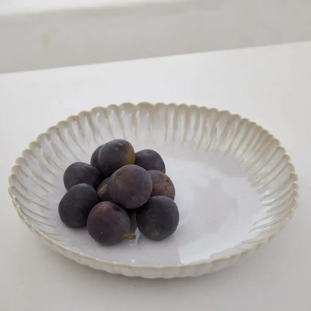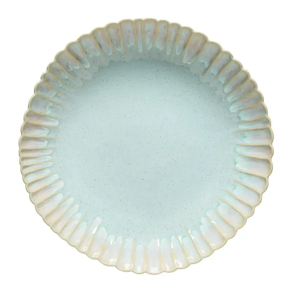 The Mallorca collection captures the natural landscape of the famous Mediterranean island, a haven of turquoise waters, soft golden sands, and impressive cliffs. Mallorca shares its DNA with our Eivissa collection, featuring reactive glazes of sand-beige and sea-blue patterns. Yet, its soft and scalloped edges suggest a more exquisite look. Combine both shapes for a casual and eclectic look. Due to the reactive glazes, the blended patterns of sand beige and sea blue will vary slightly, making each piece is one-of-a-kind.