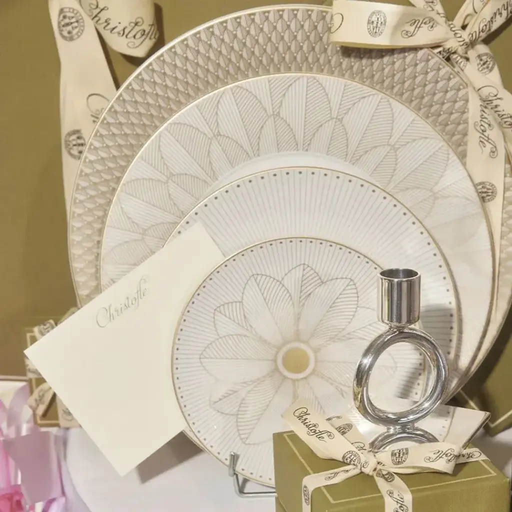 Limoges porcelain with platinum decoration from Malmaison Impériale Collection. Thanks to its creations in silver, Christofle is a symbol of luxury and elegance. Since its founding in the mid-19th century, it has been a continous innovative force and has infused each era with a new art of living. Thus, over time, this prestigious company has revolutionized styles, techniques, and methods for the production and distribution of silver plate and the decorative arts. A player in and privileged witness to the evolution of taste, customs, and traditions, Christofle has always seen its name associated with major creative trends, renowned artists such as Man Ray or Jean Cocteau, avant-garde architects such as Gio Ponti, and modernist silversmiths such as Lino Sabattini and Christian Fjerdingsatd, as well as present-day designers such as Andrée Putman, Martin Szekely or Ora ïto. Today, as in the past, whether gracing the tables of emperors, princes, or maharajas, in palaces, on board the Trans-Siberian Railway, Orient Express, or transatlantic ocean liners, or in the contemporary restaurants, Christofle continues to make an impression.