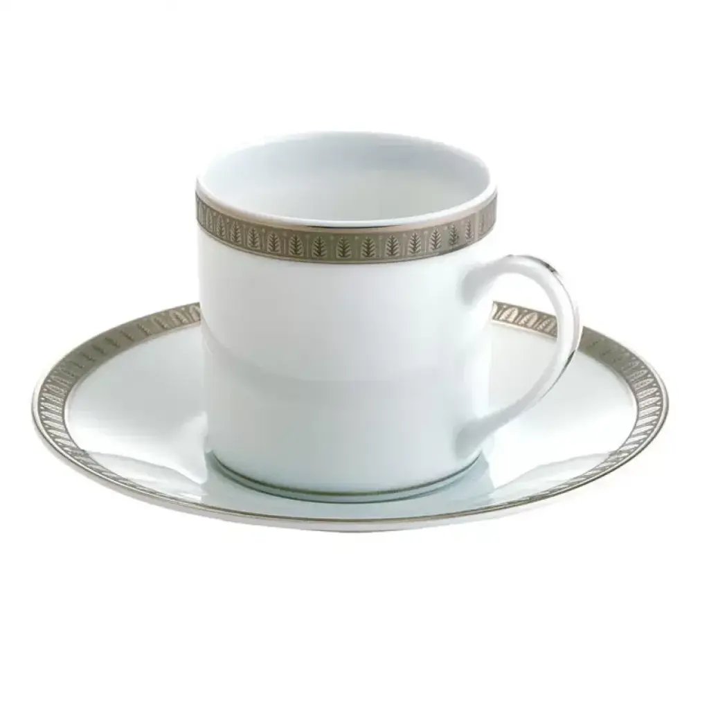 One Christofle's most historic patterns, Malmaison typifies the Empire style, with its frieze of delicate palm and lotus leaves. Each piece is crafted from fine porcelain and finished with a border of pure gold or platinum. Five-piece place setting includes dinner plate, dessert plate, bread & butter plate, teacup and saucer. Thanks to its creations in silver, Christofle is a symbol of luxury and elegance. Since its founding in the mid-19th century, it has been a continous innovative force and has infused each era with a new art of living. Thus, over time, this prestigious company has revolutionized styles, techniques, and methods for the production and distribution of silver plate and the decorative arts. A player in and privileged witness to the evolution of taste, customs, and traditions, Christofle has always seen its name associated with major creative trends, renowned artists such as Man Ray or Jean Cocteau, avant-garde architects such as Gio Ponti, and modernist silversmiths such as Lino Sabattini and Christian Fjerdingsatd, as well as present-day designers such as Andrée Putman, Martin Szekely or Ora ïto. Today, as in the past, whether gracing the tables of emperors, princes, or maharajas, in palaces, on board the Trans-Siberian Railway, Orient Express, or transatlantic ocean liners, or in the contemporary restaurants, Christofle continues to make an impression.