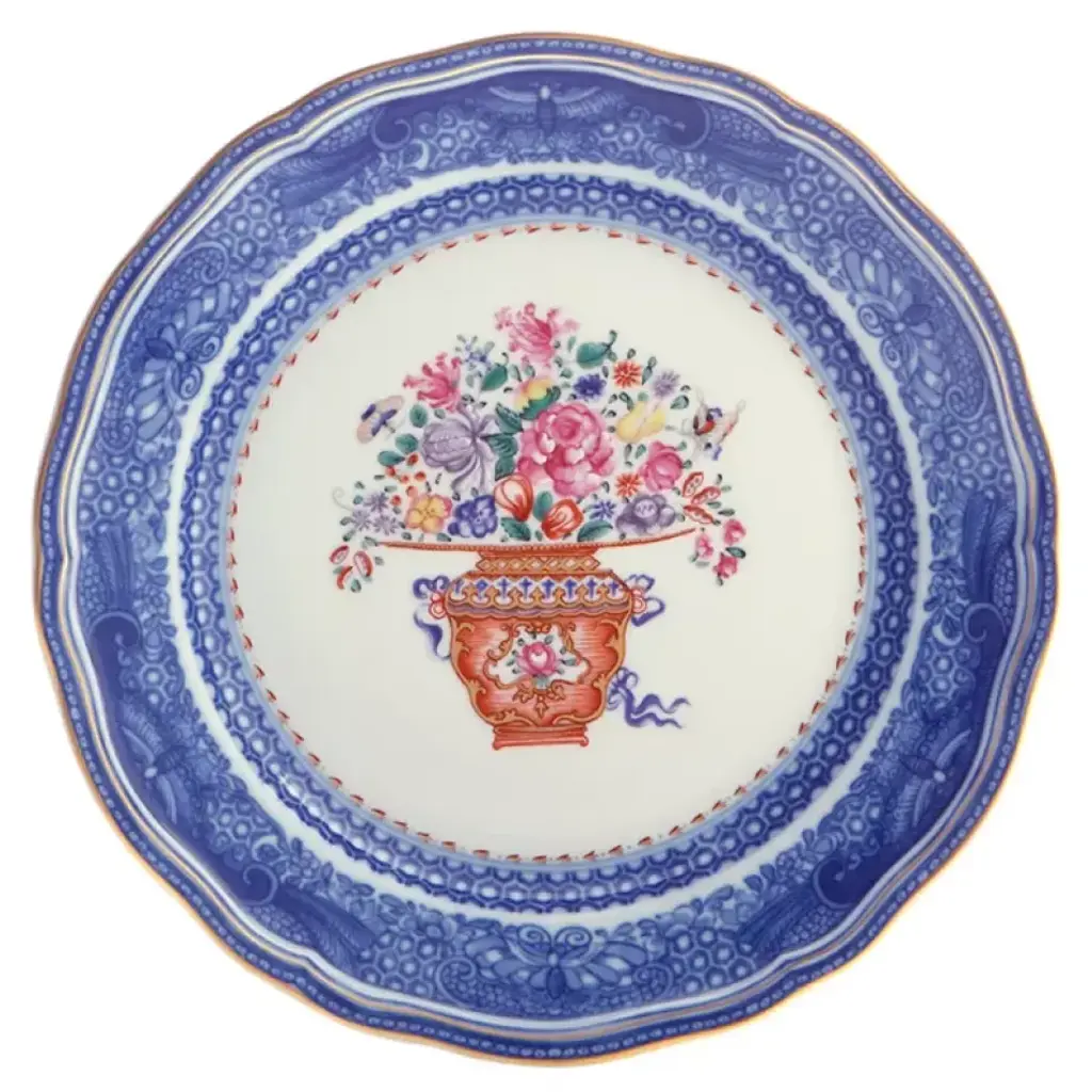 The bouquet decorates the outside of the charming cup. A favorite with brides, Mottahedeh specializes in luxurious patterns and unique, elegant shapes that are reproduced from china found in museums and historical societies. The patterns feature complex and vibrant colors, and hand-painted gold decoration. The pieces are surprisingly fresh and timely, and look wonderful in both contemporary and traditional dining rooms.