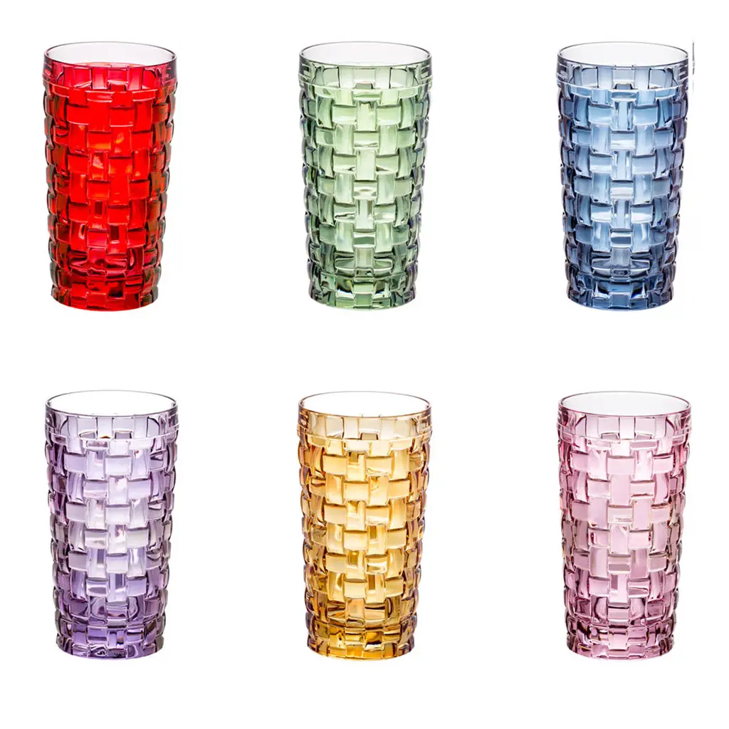 Exquisite craftsmanship, striking texture, and unique color combinations are the alluring qualities of this set of six water glasses of the Manhattan Collection. The linear silhouette of the pieces in glass is hand decorated by hand with a superb series of geometric patterns juxtaposed to create an enlivening surface, highlighted by the different colors that give each glass a distinct character. Used for both everyday and formal occasions, this set is combined with the glasses from the same series to make an elegant statement. Each glass is 10 cm in height.