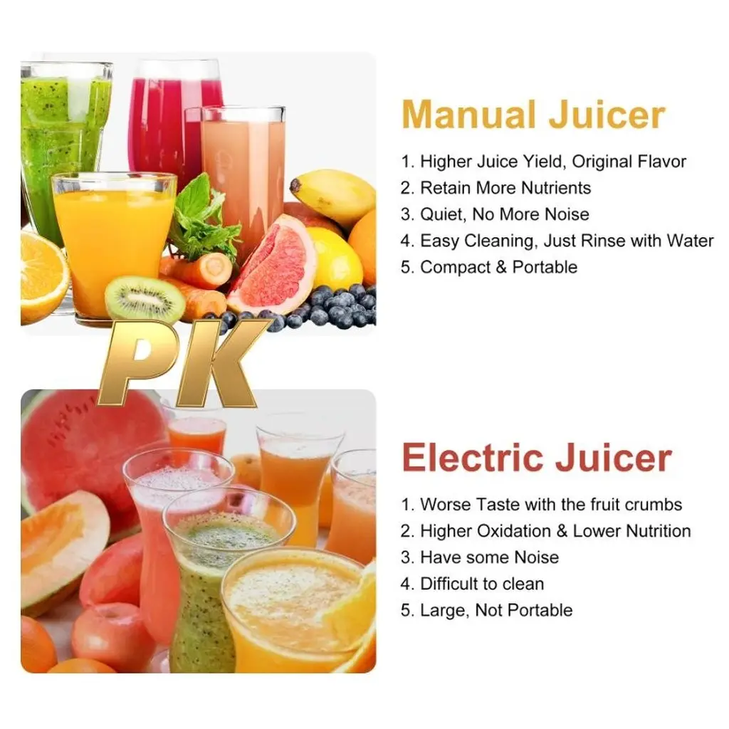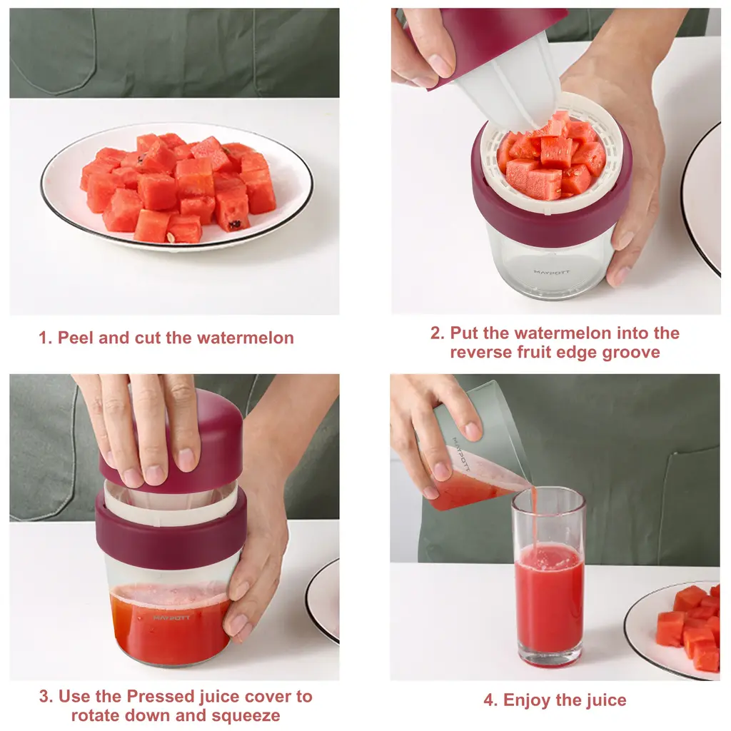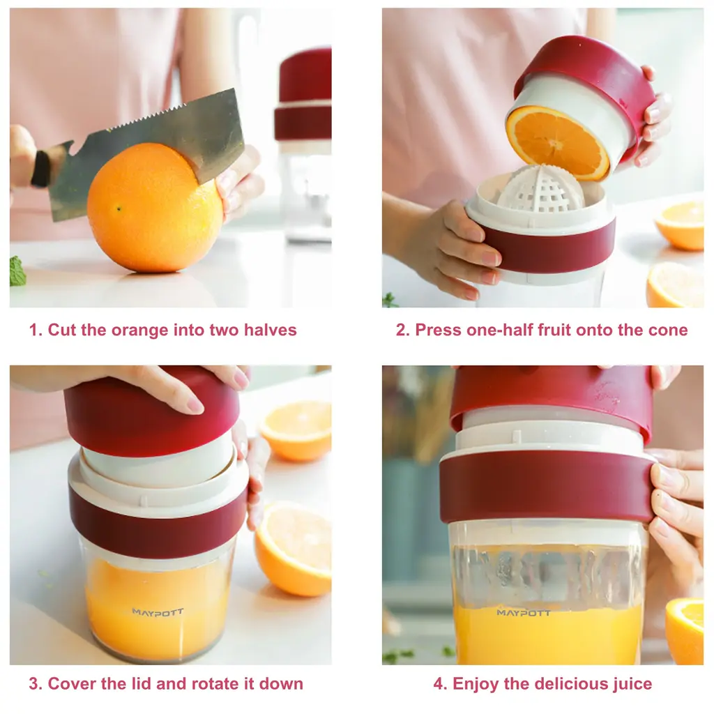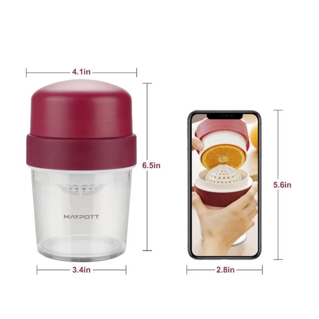 SAFE AND HEALTHY - This BPA - free food grade ABS hand juicer will really help you live a more healthy life. You can use it to squeeze oranges, lemons, tangerines and grapefruits to extract enough vitamin for your family every dayEFFICIENT DESIGN: Using spiral extrusion, the amount of juice is increased by 17% compared to the ordinary extrusion method.You can use it to squeeze oranges, lemon, grapefruit, watermelon, grape, pomegranate, pineapple and other fruits to extract enough fresh fruit juice for your family every day.Multifunctional:Manual juicer conveniently helps you add juice into your delicious food exactly, perfect for fresh juice marinades, flavoring dishes, creating tasty mixed drinks and craft cocktails, and more.EASY TO USE: Citrus juicer has two methods of use,you just need switch the middle grey concave filter up and down, put the fruit in the filter and rotate this orange juicer, and then press down and rotate, and you will get the juice.CONVENIENT STORAGE:Closed combination, will not pollute the internal structure by external dust, clean and healthy.The hand juicer suit design, Fully consider saving space. You can put the hand press juicer in the drawer and travel bag. Perfect for indoor and outdoor use, like camping, picnic, etc.Product descriptionSize:Orange JuicerMaypott hand juicer manual orange citrus squeezer is an easy-to-use kitchen gadget which totally give your hand a break, it will simplifies and speeds up the process of extracting delicious citrus juices.HAND JUICER FEATURES:- Save time with this hand juicer which conveniently filters seeds, heavy pulps and citrus rinds out of your juice, you will get an original flavor reserved juicer in seconds with this citrus juicer.- The comfortable rotary lid handle design enables effortless squeezing while hygienically collecting your juice without any splatter or get your hands sticky.- No batteries, power, or long power cord, this hand juicer will not too loud and wake up the whole family up in the morning.- 450ML / 15 oz. large capacity allow you store around 4-5 oranges a time, this hand juicer container is enough for the family to use.- The citrus juicer has rubber padding on the bottom of the juicer that prevents it from toppling during juicing.HAND JUICER ADVANTAGES:- Made of premium BPA - free food grade ABS body, never worried about noxious odor or toxic decomposition.- Perfect size for squeezing lemons, limes, oranges and other citrus fruits with a minimum of time and effort.- Perfect size holes to allow all of the juice to be extracted yet none of the seeds or heavy pulp will pass through.- Original flavor reserved with this hand juicer.- Dishwasher safe and easy to clean.HAND JUICER SPECIFICATIONS:Material: Premium BPA - free food grade ABSColor: Red Clear colorTotal height: 6.69 inchContainer capacity: 450ml /15.21ozPackage contains:1 x Manual Fruit Juicer