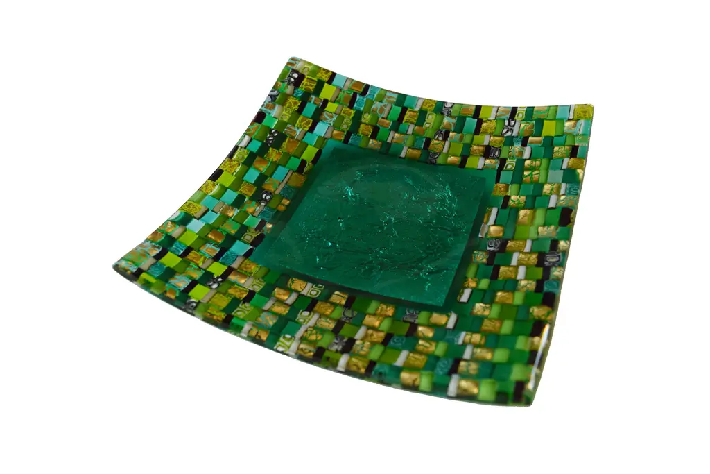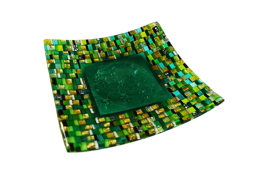 - Decorative plate in Murano glass - Central decoration in transparent green glass - Silver leaf and multicolored side decorations - Embellished with gold leaf Signed by Maker,Labeled by Maker,Signed by Maker,Labeled by Maker