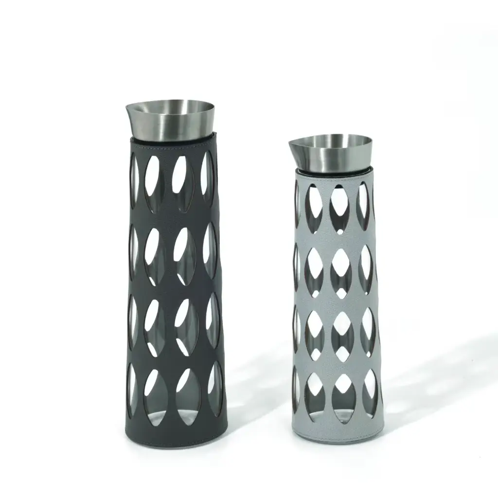 Set the table with this cylindrical glass carafe with a leather cover. The leather is decorated with laser-cut, diamond-shaped cut-outs spaced evenly around the carafe, for an original and modern look. A metal spout with a lip complete this piece that is perfect for serving up liquids at meals. Comes in two sizes and a host of colors of leather.