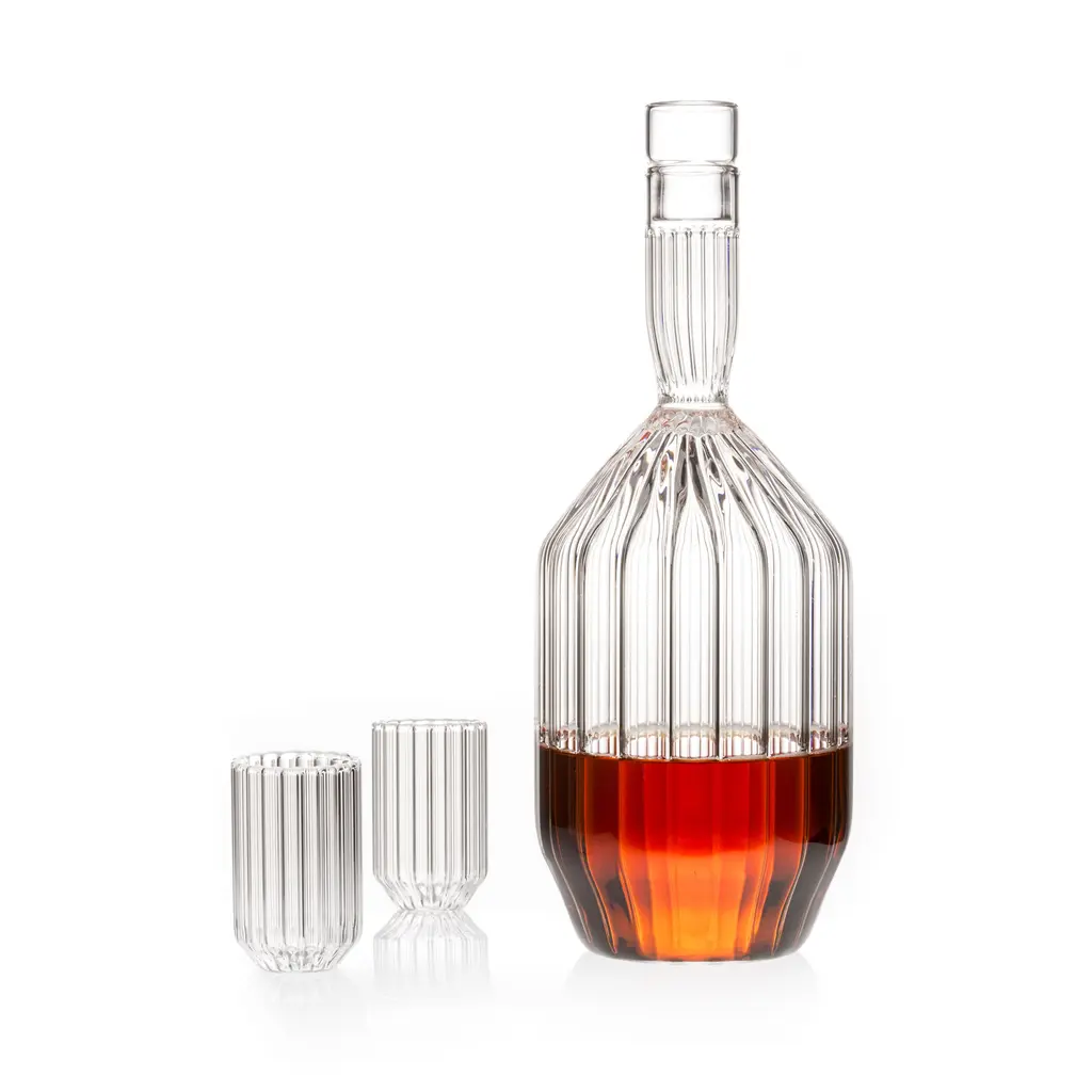 An elegant take on maximalist design, the Margot collection also re-interprets the traditional hand-cut glassware design. Felicia Ferrone designed the line with fluting on the interior of the glass, leaving the exterior smooth. Elegant and bold, the Margot Decanter doesn’t blend into the background. It features an eye-catching fluted pattern and a distinctive silhouette with a slender neck. This decanter has a capacity of 30 fl oz, or 900 ml. It’s crafted by master glassblowers without the use of any molds. The borosilicate glass makes the Margot Decanter conveniently dishwasher-safe. Use this decanter with any of the Margot glasses or pair it with the matching fferrone design Dearborn collection, also available in our shop.
