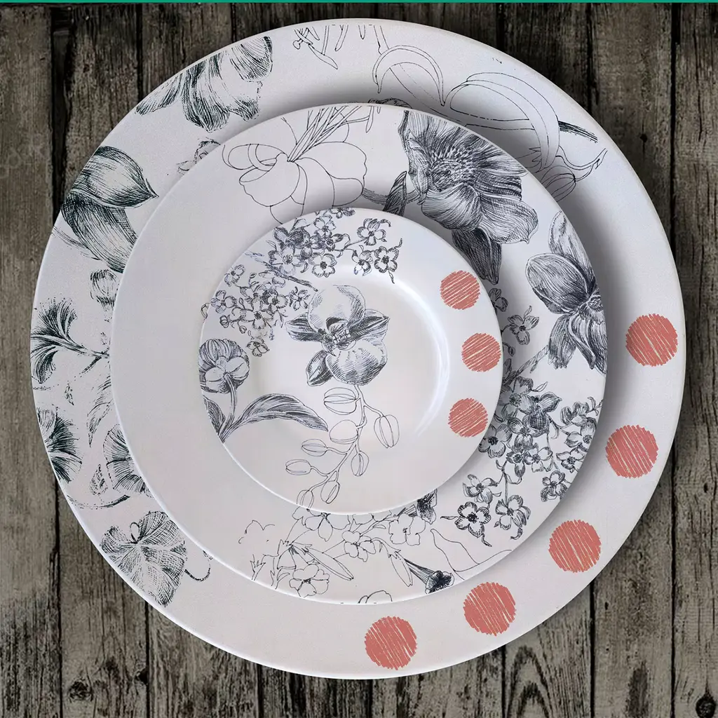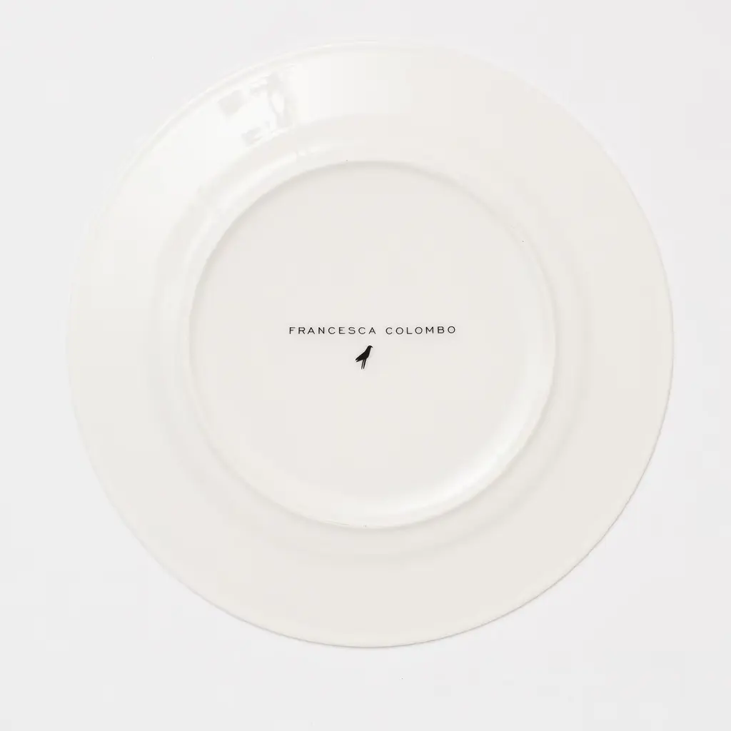 This stunning dinner plate from the Marie Antoinette series of porcelain ware brims with sophisticated and romantic allure in its extraordinary floral decoration that resembles a pencil drawing. Enhanced with five red spots that add color and a dynamic flair, it is entirely handcrafted of fine porcelain by master artisans.