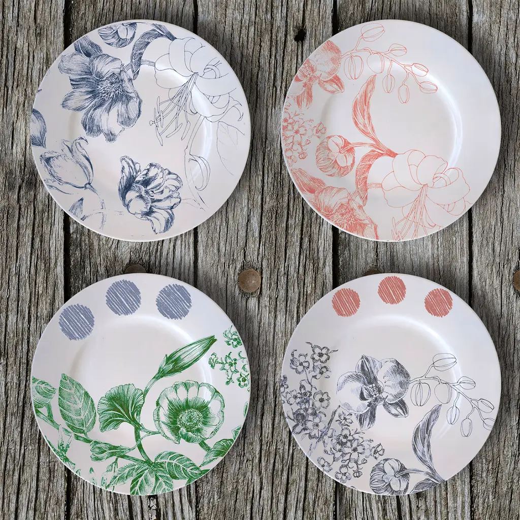 Delicately graced with a bluish floral decoration exuding a peaceful and soothing flair, this stunning set of two bread plates from the Marie Antoinette Collection is deftly handcrafted of first-rate porcelain and decorated by hand. To contrast the delicate lines of the floral motif, three red spots lend it a vivacious and dynamic allure.