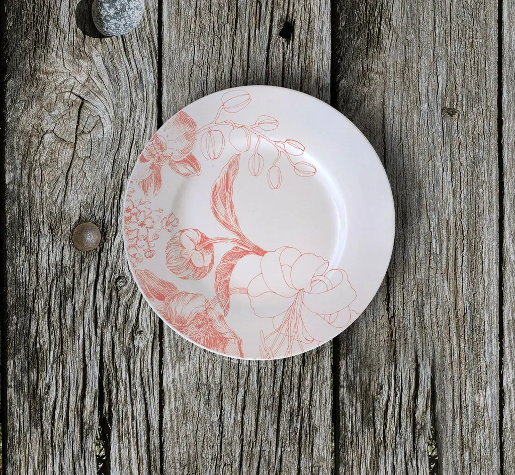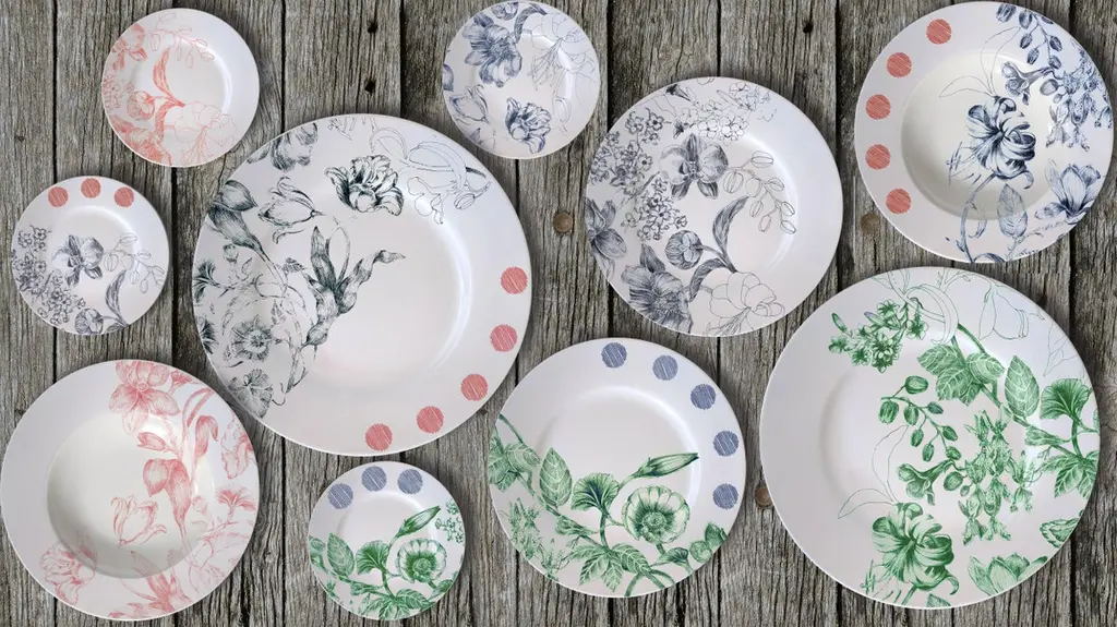 Marie Antoniette bread plates, are designed as the porcelain set of a contemporary Queen Marie Antoniette, still alive in 2020. It is an explosion of detailed flowers and blossoms, originally hand-painted with an engraving technique that is some variations of the collection, it's mixed with bold dots in pencil to achieve a contemporary atmosphere. This design has also been developed as an elegant and sophisticated wall covering. Each design varies slightly due to the manual techniques used in their manufacturing.Oven and dishwasher safe. Made in Italy.
