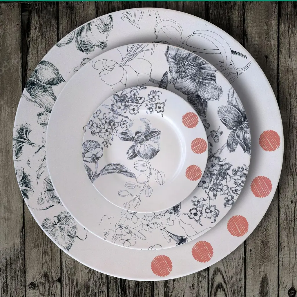 Marie Antoniette dessert plates, are designed as the porcelain set of a contemporary Queen Marie Antoniette, still alive in 2020. It is an explosion of detailed flowers and blossoms, originally hand-painted with an engraving technique that is some variations of the collection, it's mixed with bold dots in pencil to achieve a contemporary atmosphere. This design has also been developed as an elegant and sophisticated wall covering. Each design varies slightly due to the manual techniques used in their manufacturing.Oven and dishwasher safe. Made in Italy.