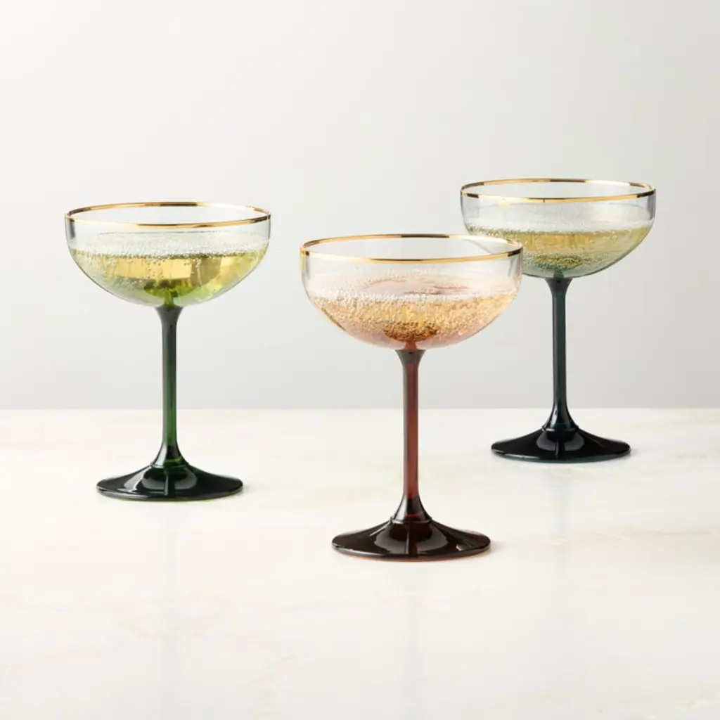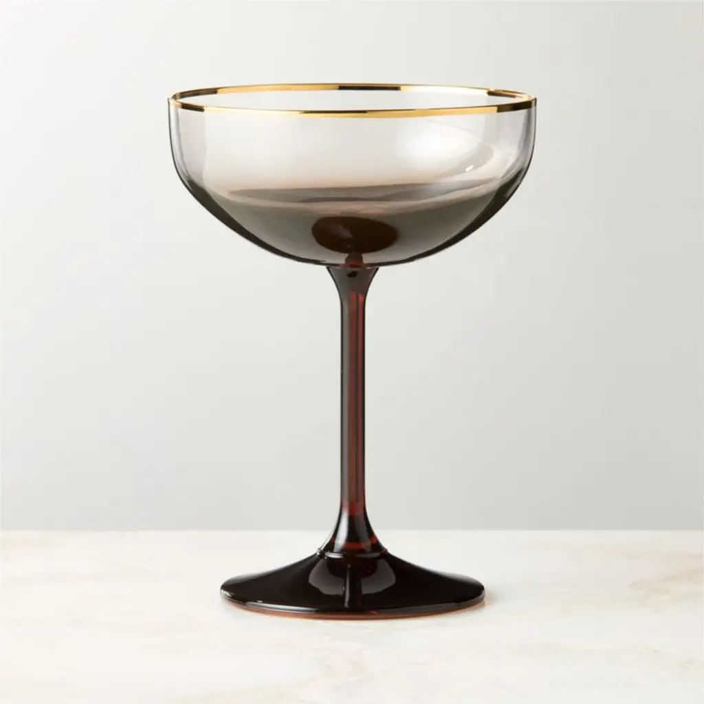 Crafted in Poland of crystalline glass, our best-selling Marie coupe glass is finished with a reddish-bronze ombre tint to add a vintage-inspired touch. Adorned with a 17K gold-painted rim, the wide bowl is perched atop a short stem for a more modern feel. Pair with the other Marie coupe glasses for a coordinated cocktail hour. CB2 exclusive.