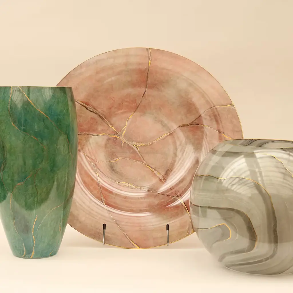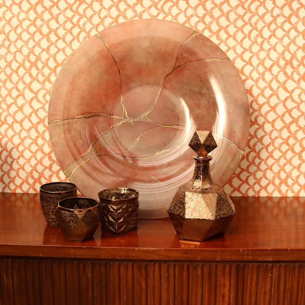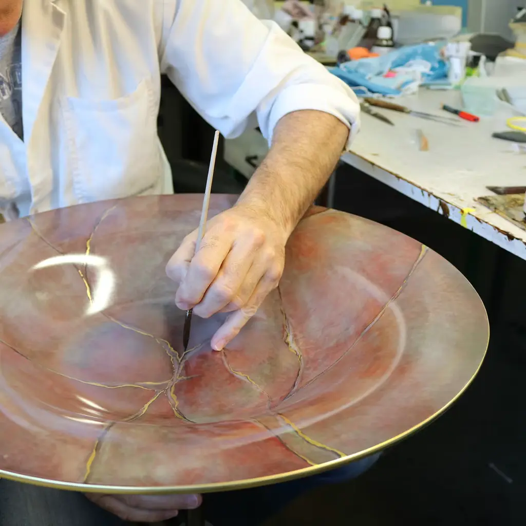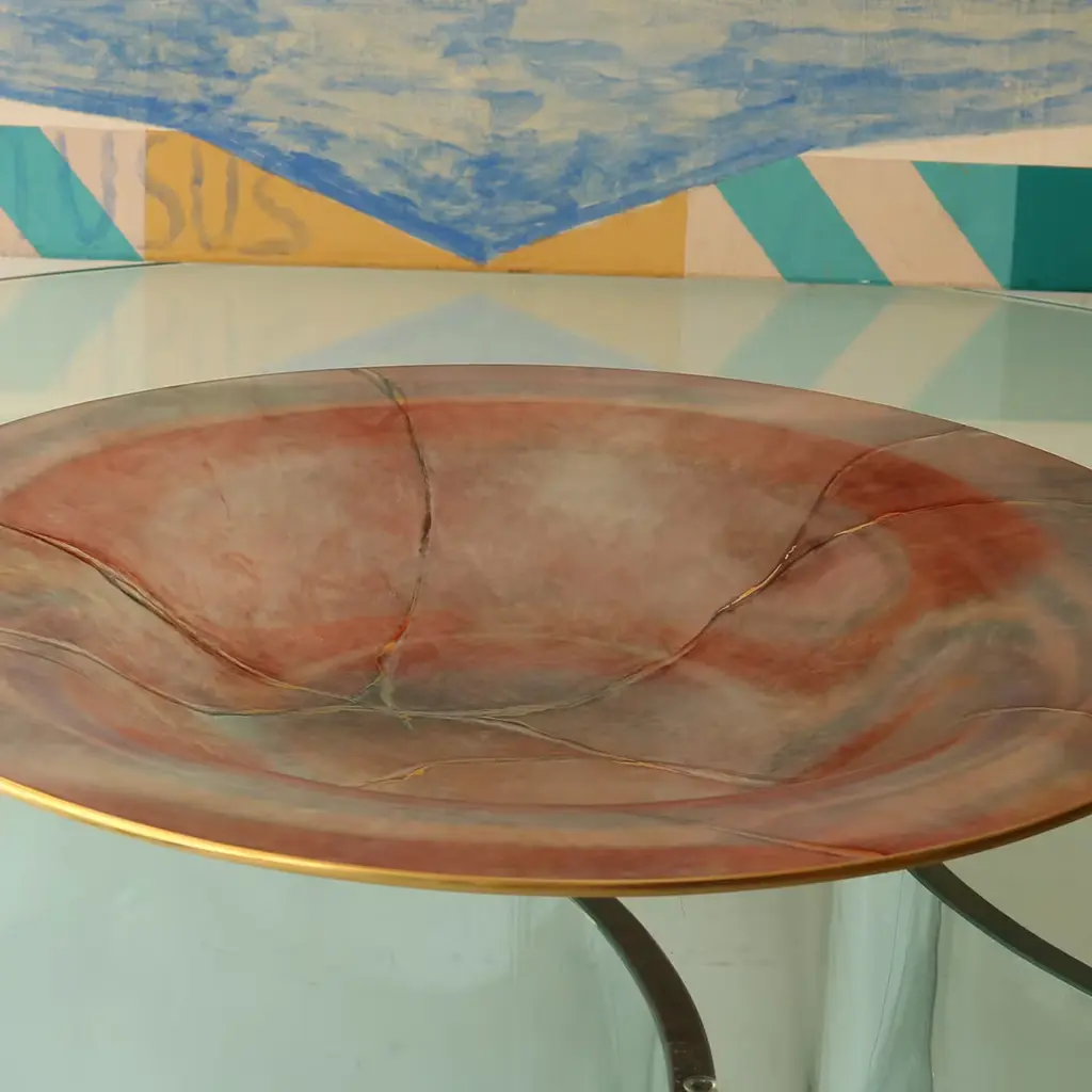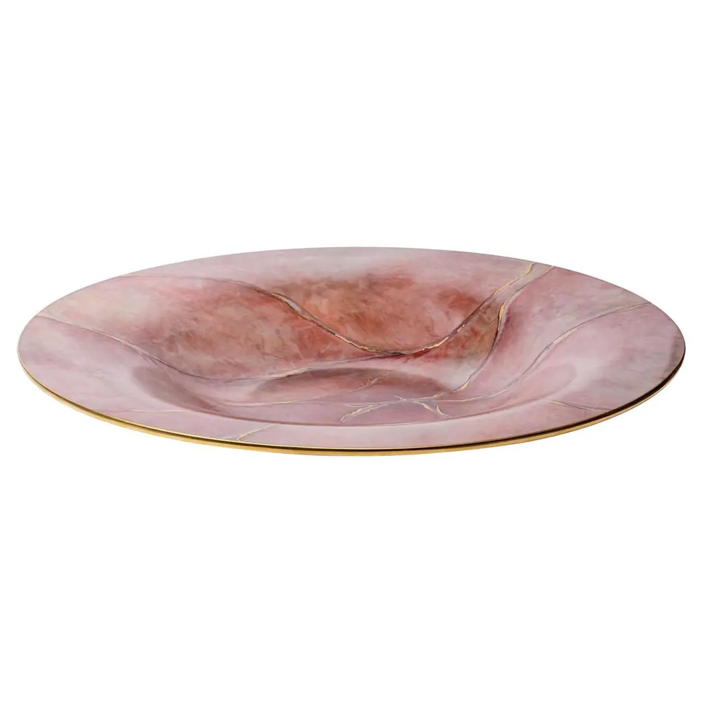 This superb pink plate is part of the brand new Marmo Collection of decorative objects with a marble appearance strictly handmade of glass. The marble effect is obtained with ad hoc colors enhanced by hand-colored golden veins that re-interpret the marble texture, resulting in a unique piece of refined allure and unmistakable luxury that will suit both classic and contemporary decors. Please ask the concierge for customization options.