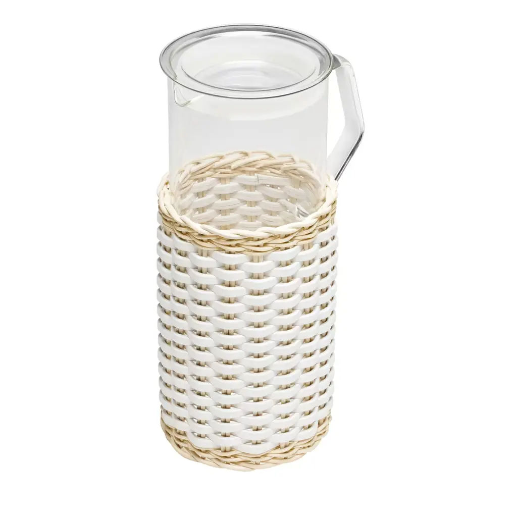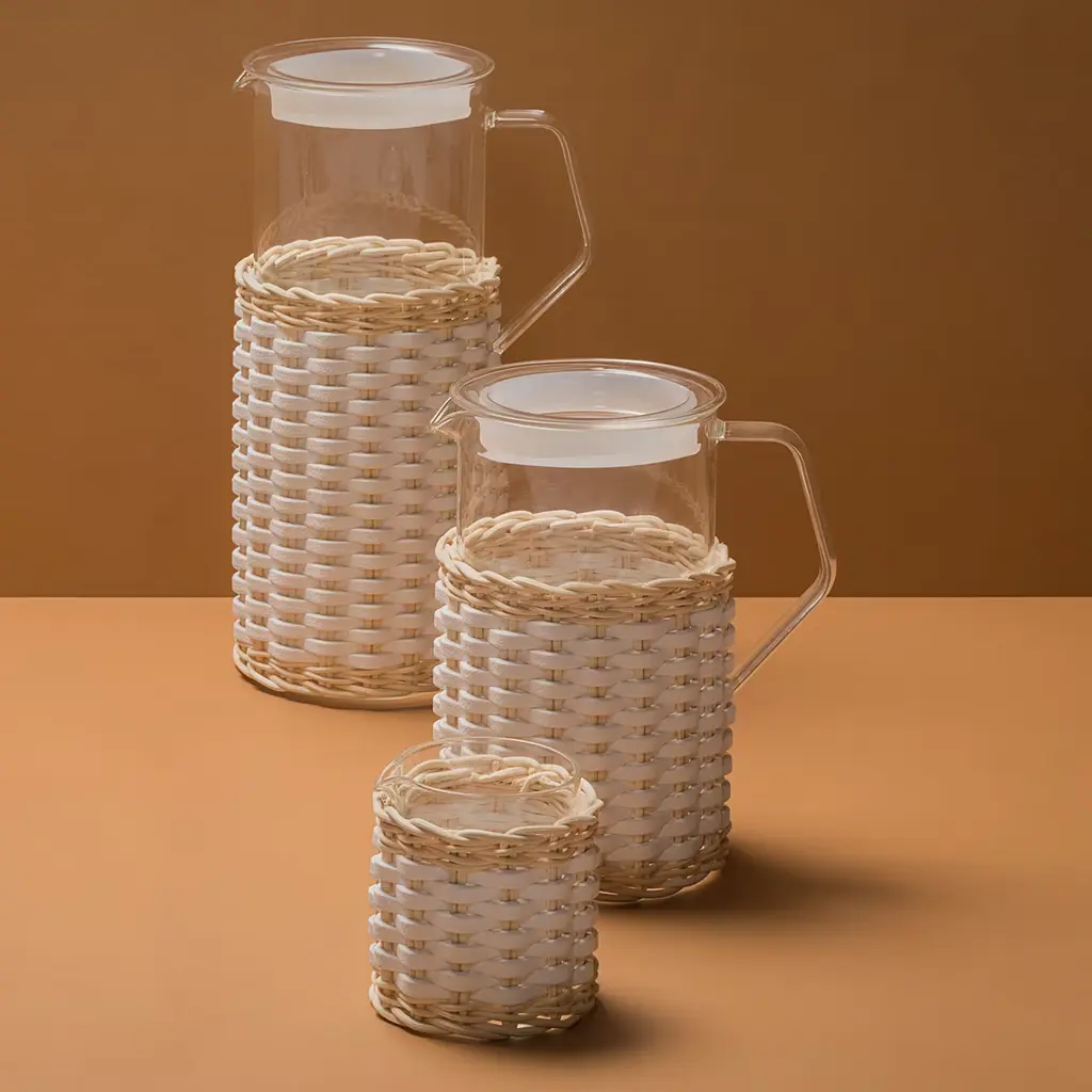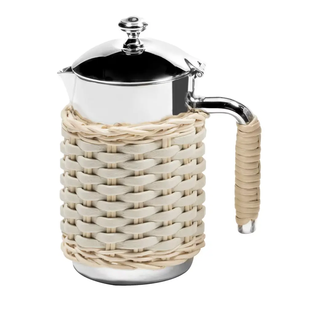 Transparent borosilicate glass partially dressed in woven leather and rattan. Featuring a glass lid with a silicone ring and heat-resistant glass body, it can be used for both hot and cold drinks. Only available with natural rattan combined with golf or nappa leather. (0.75 Lt)