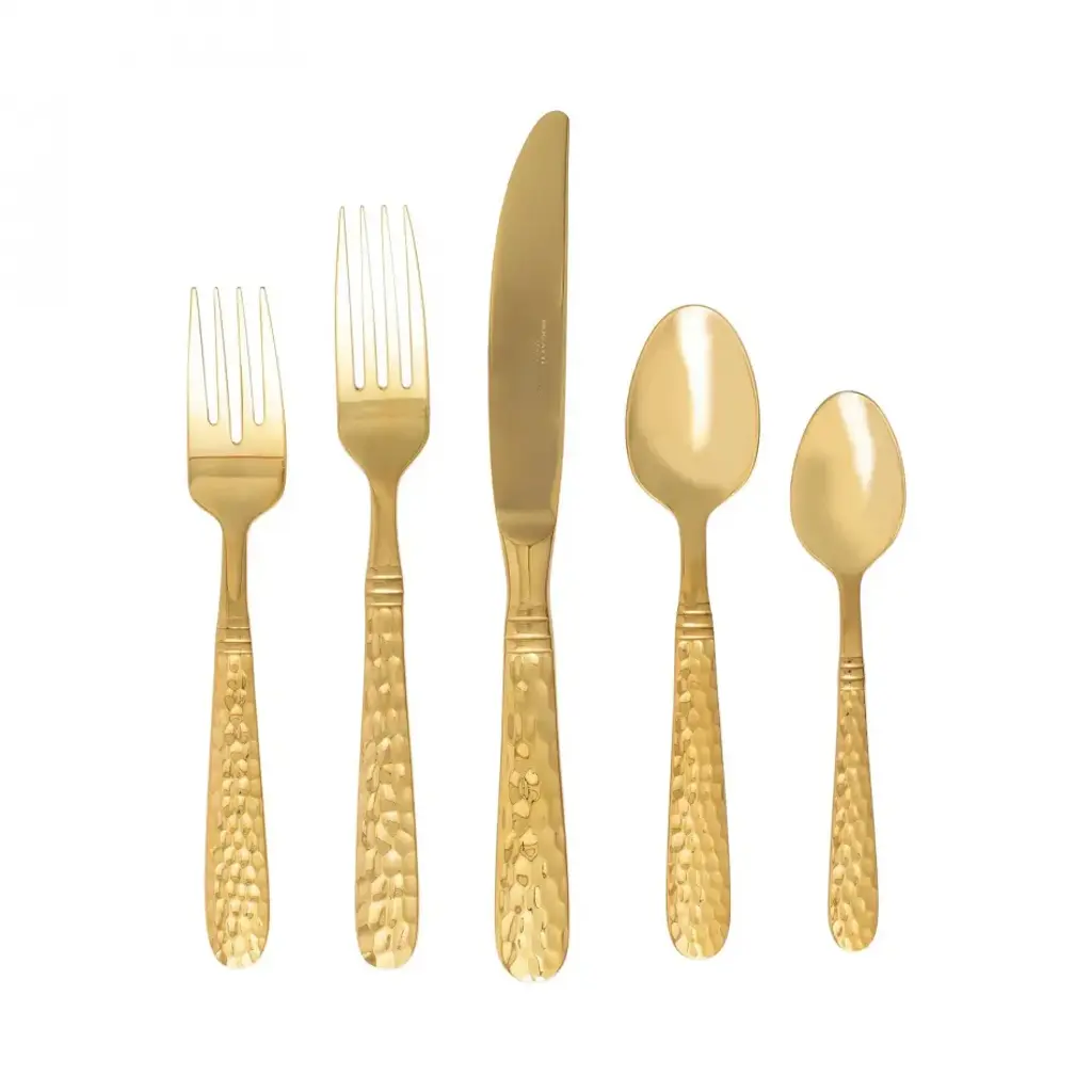 Italian artisans forge the Martellato Gold Cake Knife thus adding hammered detail. The 18/10 stainless steel combined with years of craftsmanship result in a well-balanced, weighty flatware. This hammered flatware set is made in Lumezzane, Italy, by the Bugatti family. Since 1983, Vietri has specialized exclusively in Italian handcrafted ceramics, stainless and pewter flatware, mouth blown glassware, lamps, urns and planters. Families of artisans with 3 or 4 generations of history create these special pieces using centuries-old techniques. The subtle color from a paintbrush and the curving stroke of the artist's hand are never repeated in quite the same way, making each piece truly unique.