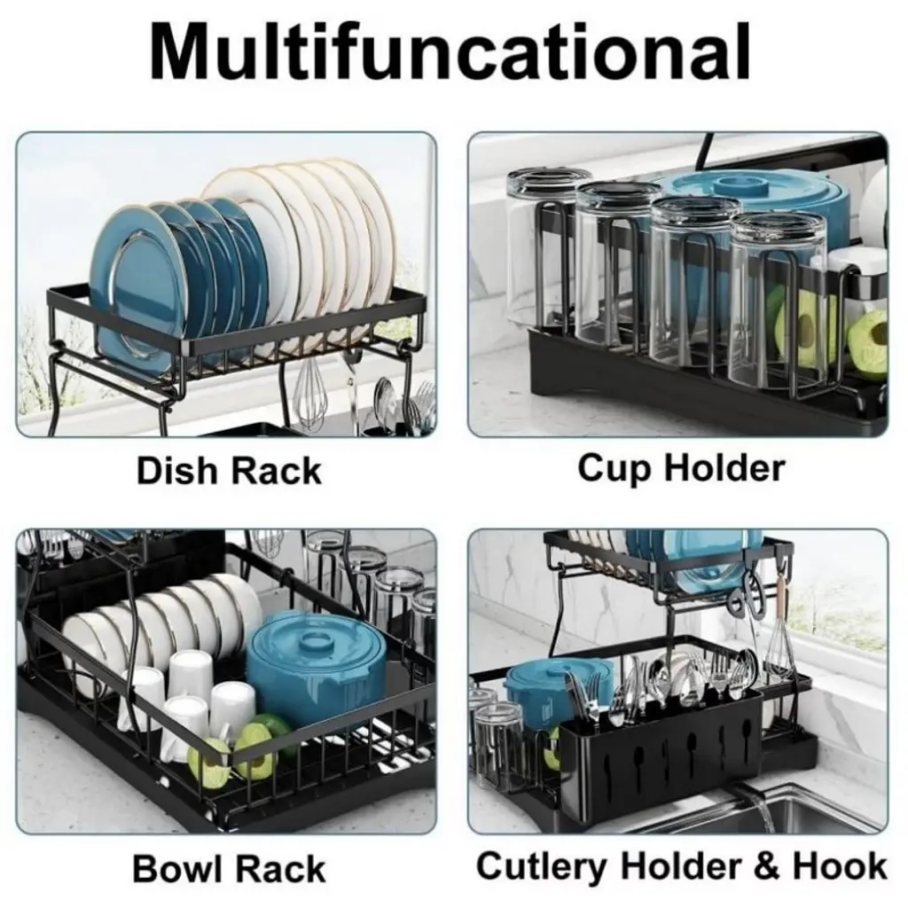 Upgrade your kitchen with this 2-Tier Stainless Steel Dish Drying Rack for Kitchen Counter. Designed with convenience and capacity in mind, it features a detachable structure that allows flexible setup based on your space and needs. The top tier holds up to 10 plates or pots, while the bottom layer fits 14 bowls. Additional side racks provide space for utensils, mugs, and cutting boards, making this dish rack a true all-in-one kitchen organizer. Built from durable rustproof stainless steel, this dish drainer rack is coated with a high-temp black finish to resist scratches and corrosion. Whether you're drying dishes or storing kitchenware, it keeps your kitchen neat and tidy. The included drainboard catches water runoff, preventing mess and protecting your countertop. Easy to assemble and maintain, it’s the perfect solution for modern kitchens.