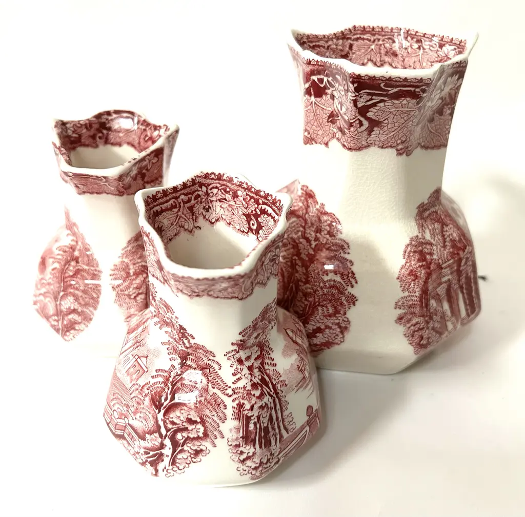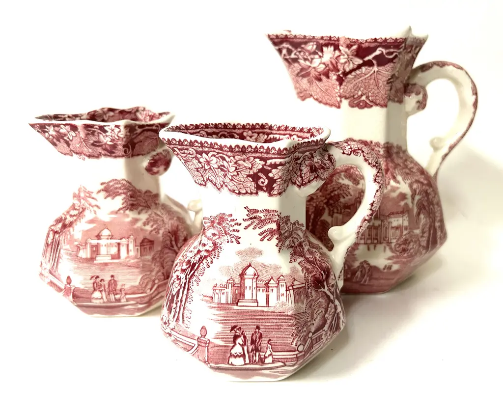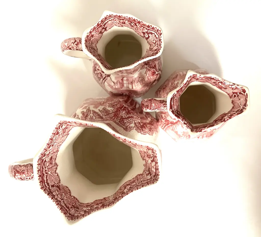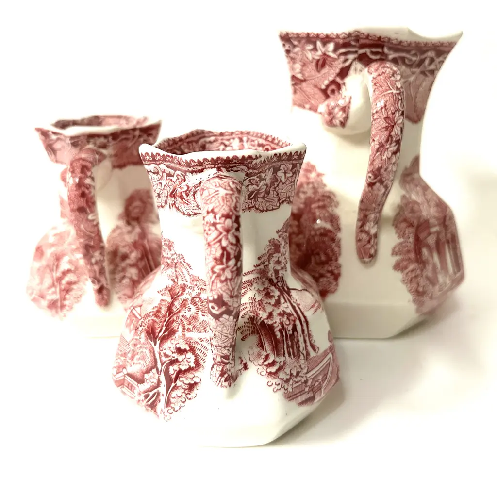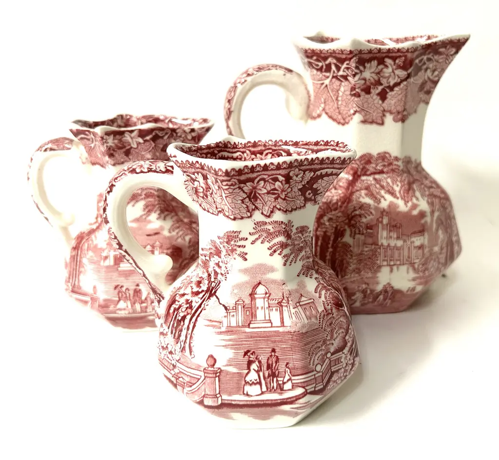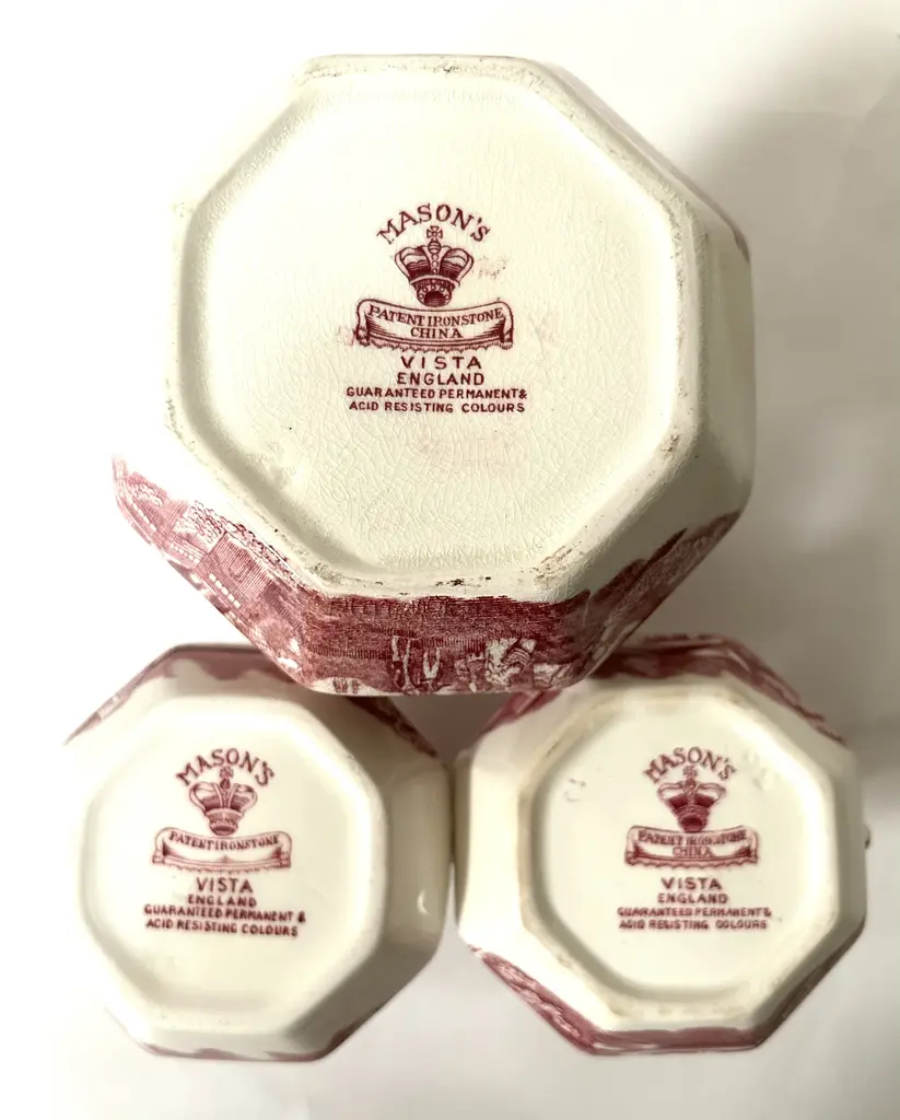 Set of three Mason’s English ironstone jugs in the one hundred year old Vista pattern. English country scenes in rich red against an ivory ground. Hydra snake handles, octagonal bodies. All three jugs marked “Mason’s Patent Ironstone China Vista England�� with company marks indicating 1940s manufacture. Dimensions: large jug - 6.5" L x 5" W x 6.5" H; other jugs - 4.5" L x 3.5"W x 4.5"H