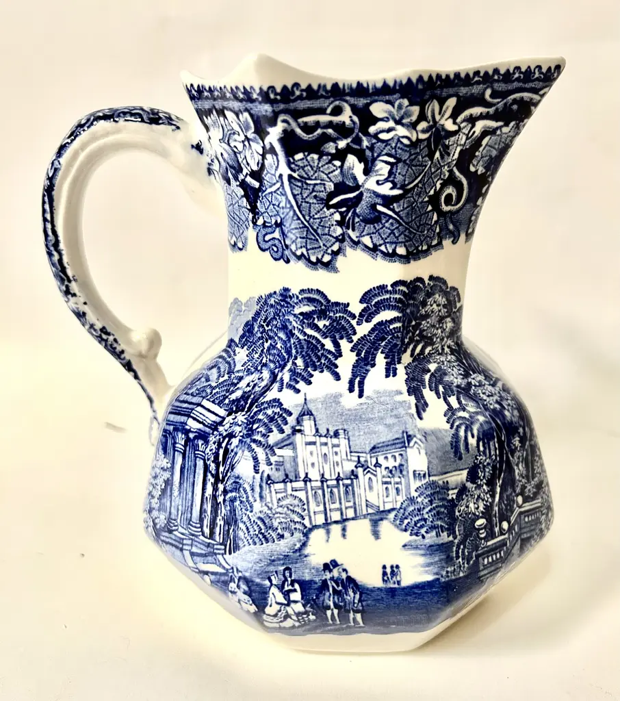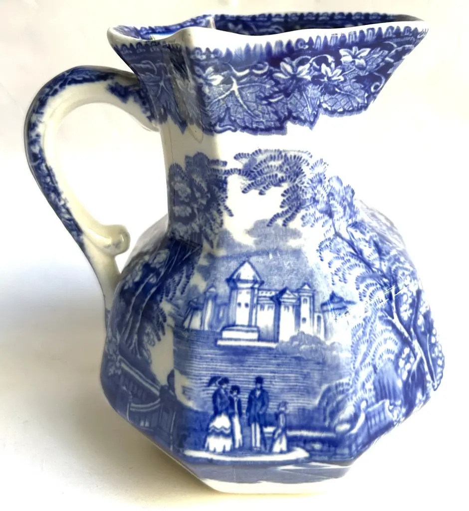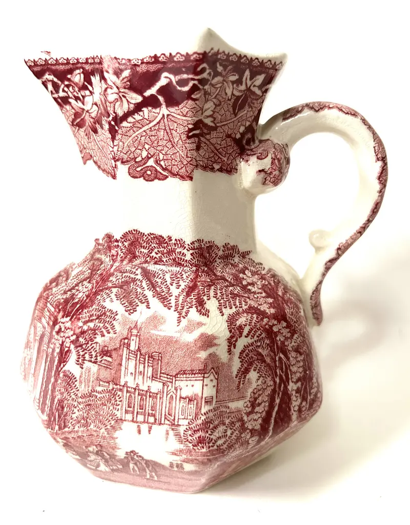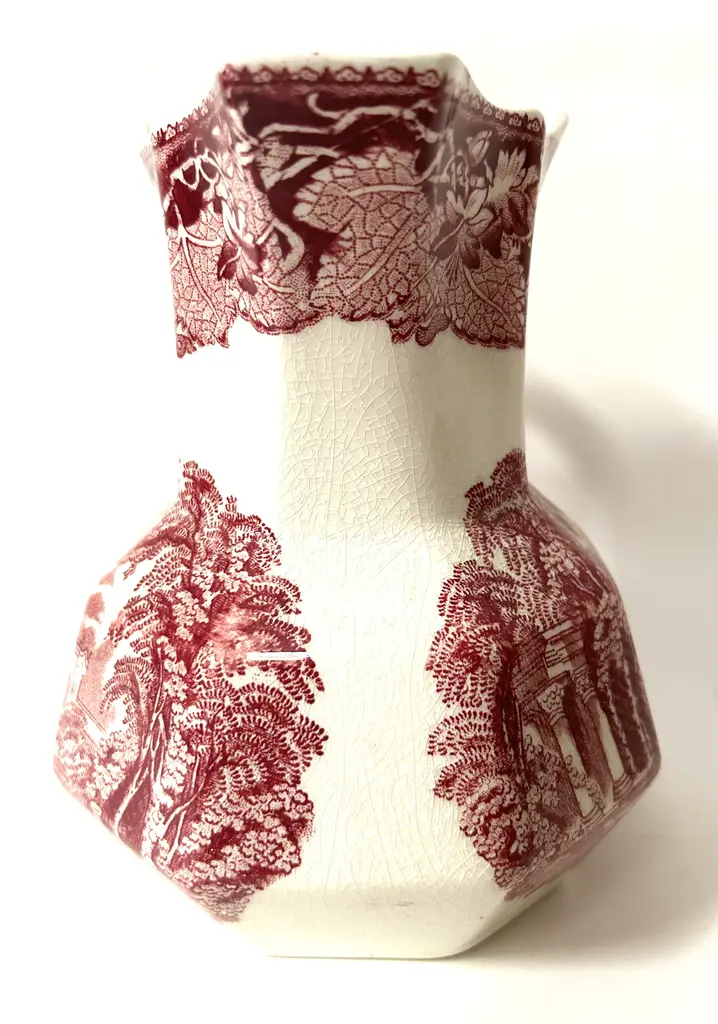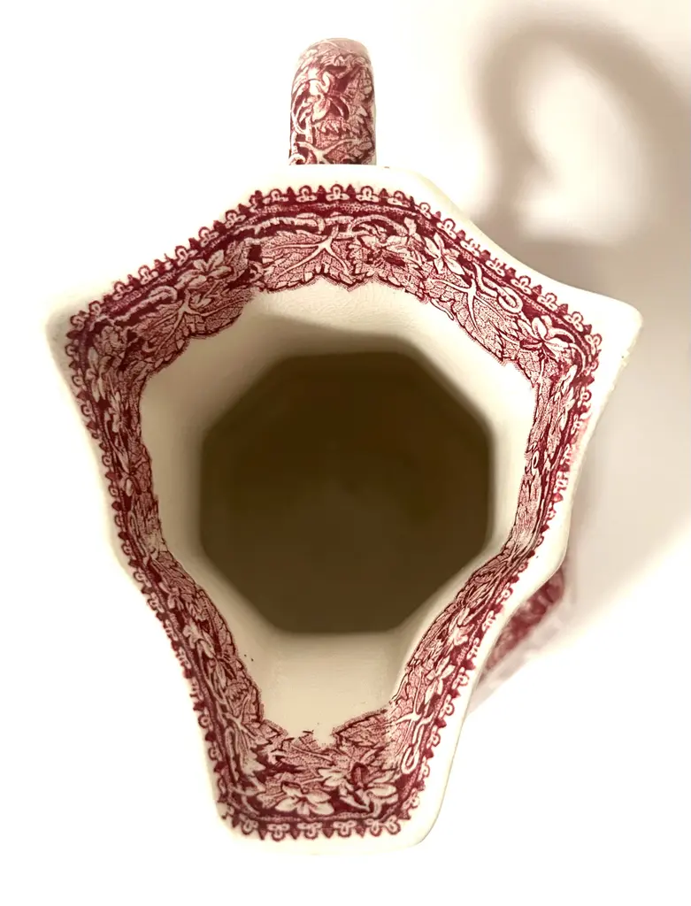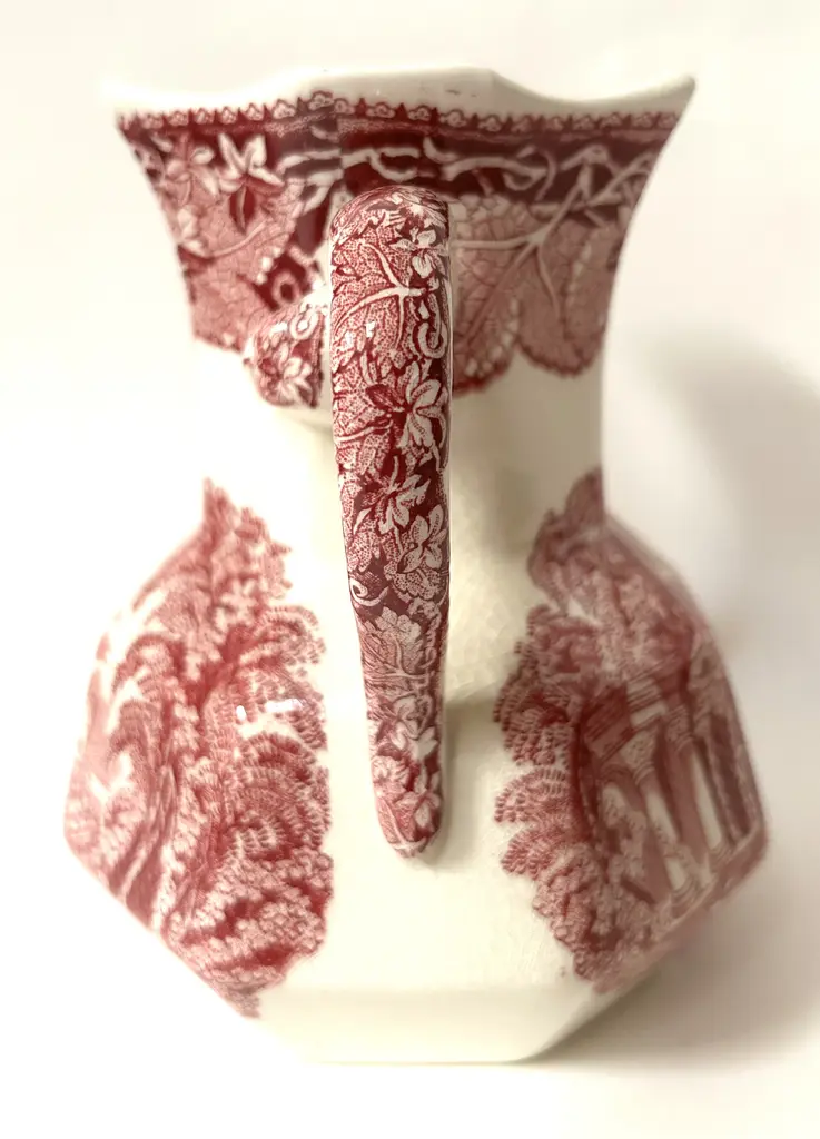 Set of three Mason’s English ironstone jugs in the one hundred year old Vista pattern. English country scenes in rich red against an ivory ground. Hydra snake handles, octagonal bodies. All three jugs marked “Mason’s Patent Ironstone China Vista England�� with company marks indicating 1940s manufacture. Dimensions: large jug - 6.5" L x 5" W x 6.5" H; other jugs - 4.5" L x 3.5"W x 4.5"H