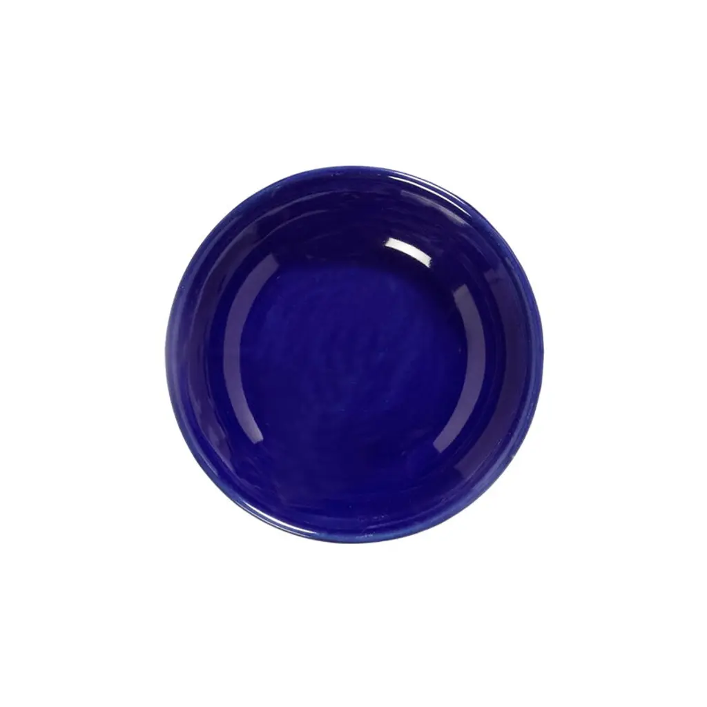 Deliberate textural irregularities are the signature characteristics marking this enthralling set of six charger plates (Ø38cm) in top-quality ceramic. Enameled in vivid blue, the plates are finished with a transparent glaze to give them their distinctive glossy look, juxtaposed to the speckled rims that are deftly hand-painted by skillful artisans.
