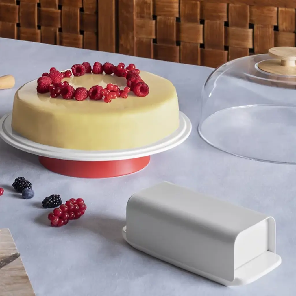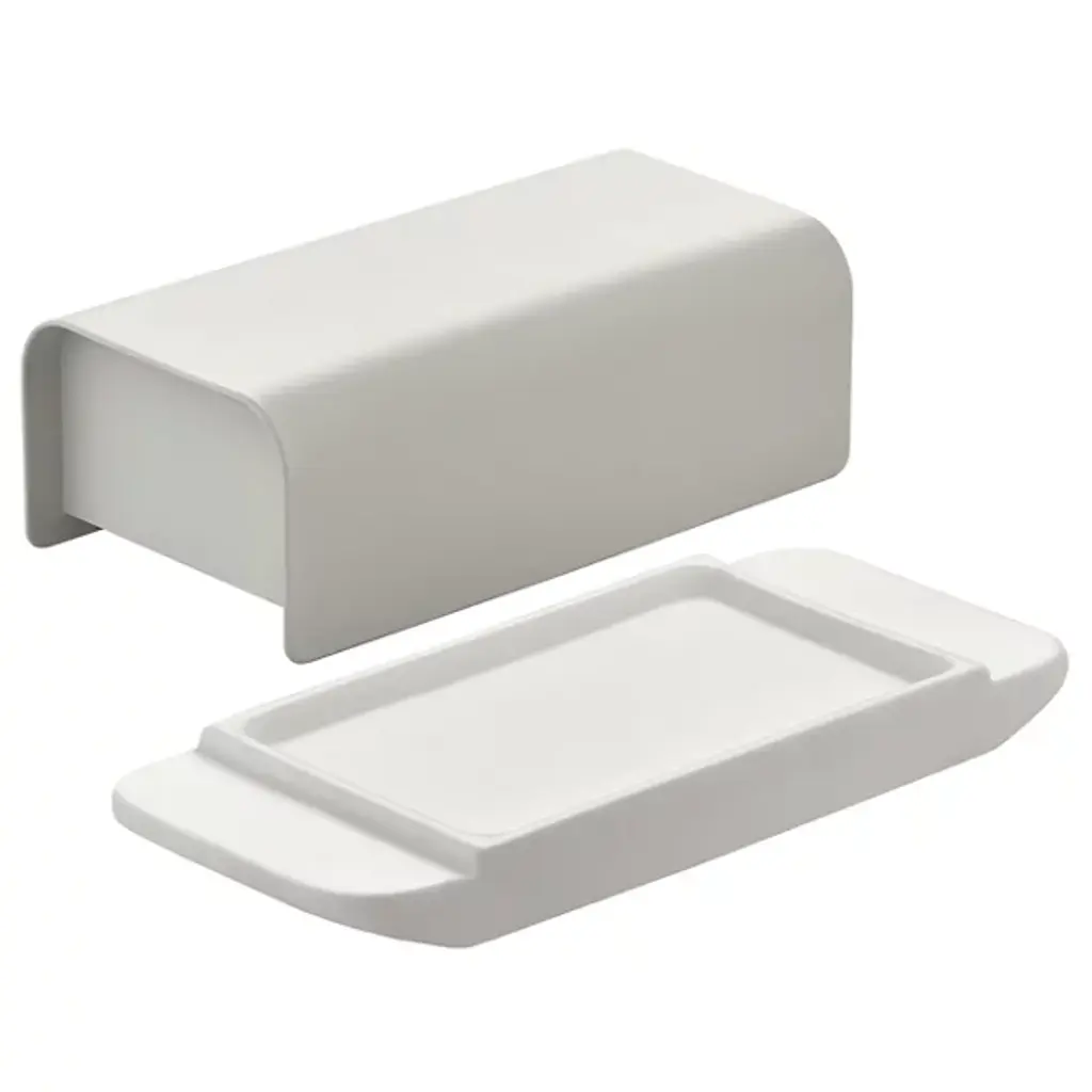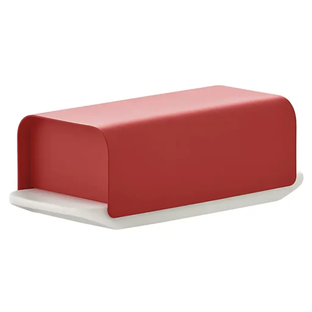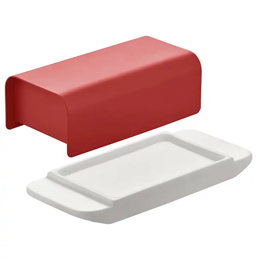 The Mattina Butter Dish from Alessi presents a traditional accessory designed to preserve butter at the ideal consistency with a clean-surfaced and timeless elegance essential to mealtime basics. A porcelain base with a raised border retains the butter, capped by a curving-edged hood housing in stainless steel that mates smoothly with the base, surfaced with a hard-wearing epoxy resin for lasting service.
