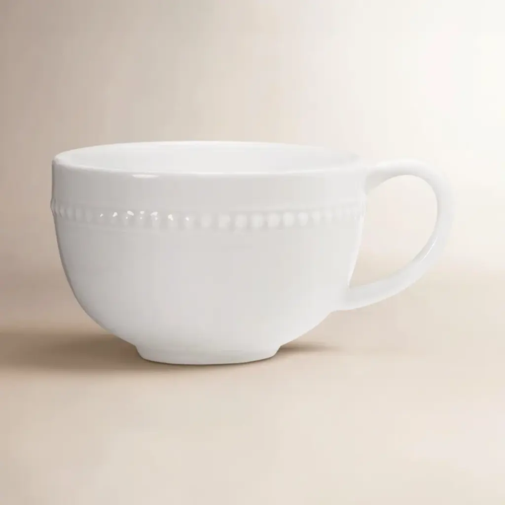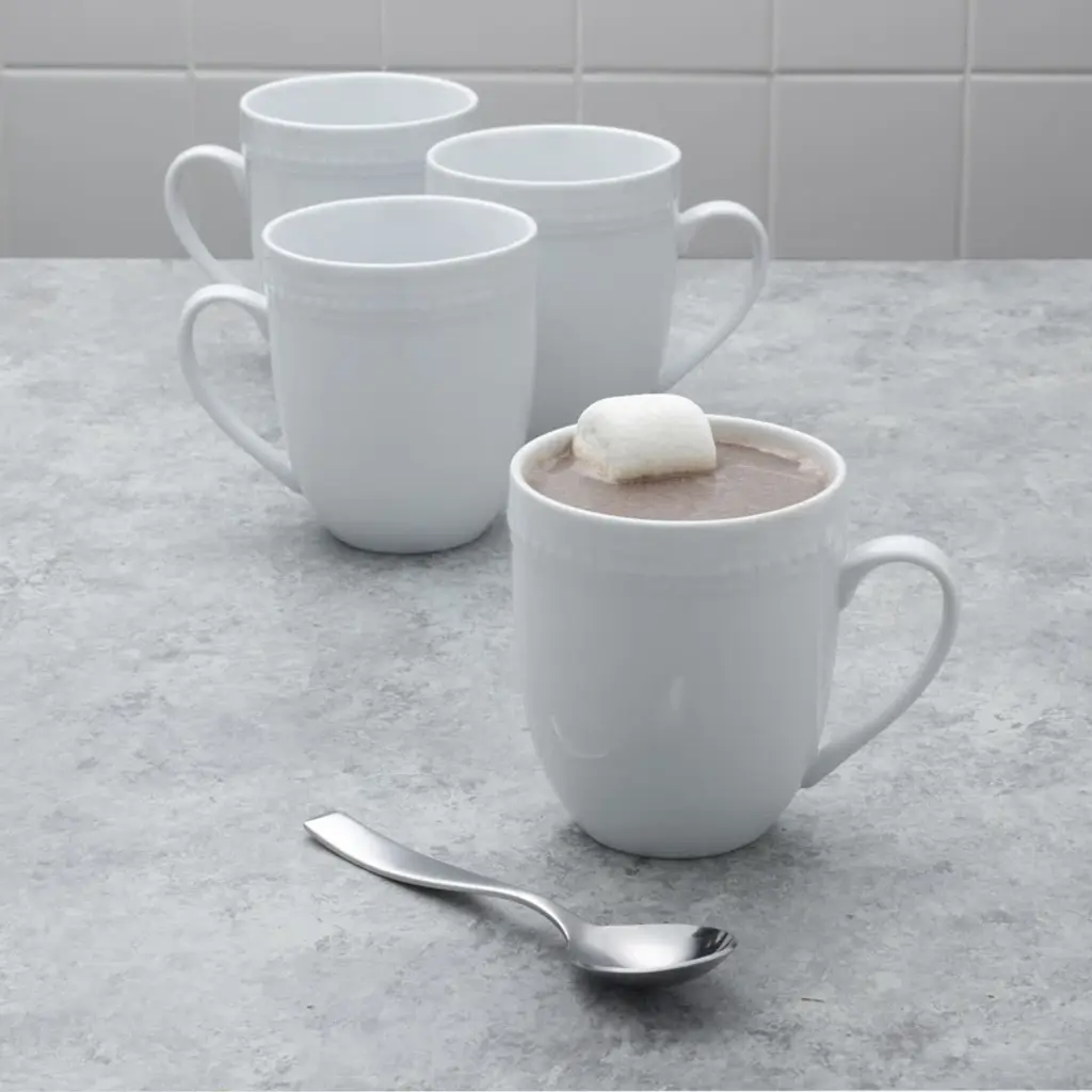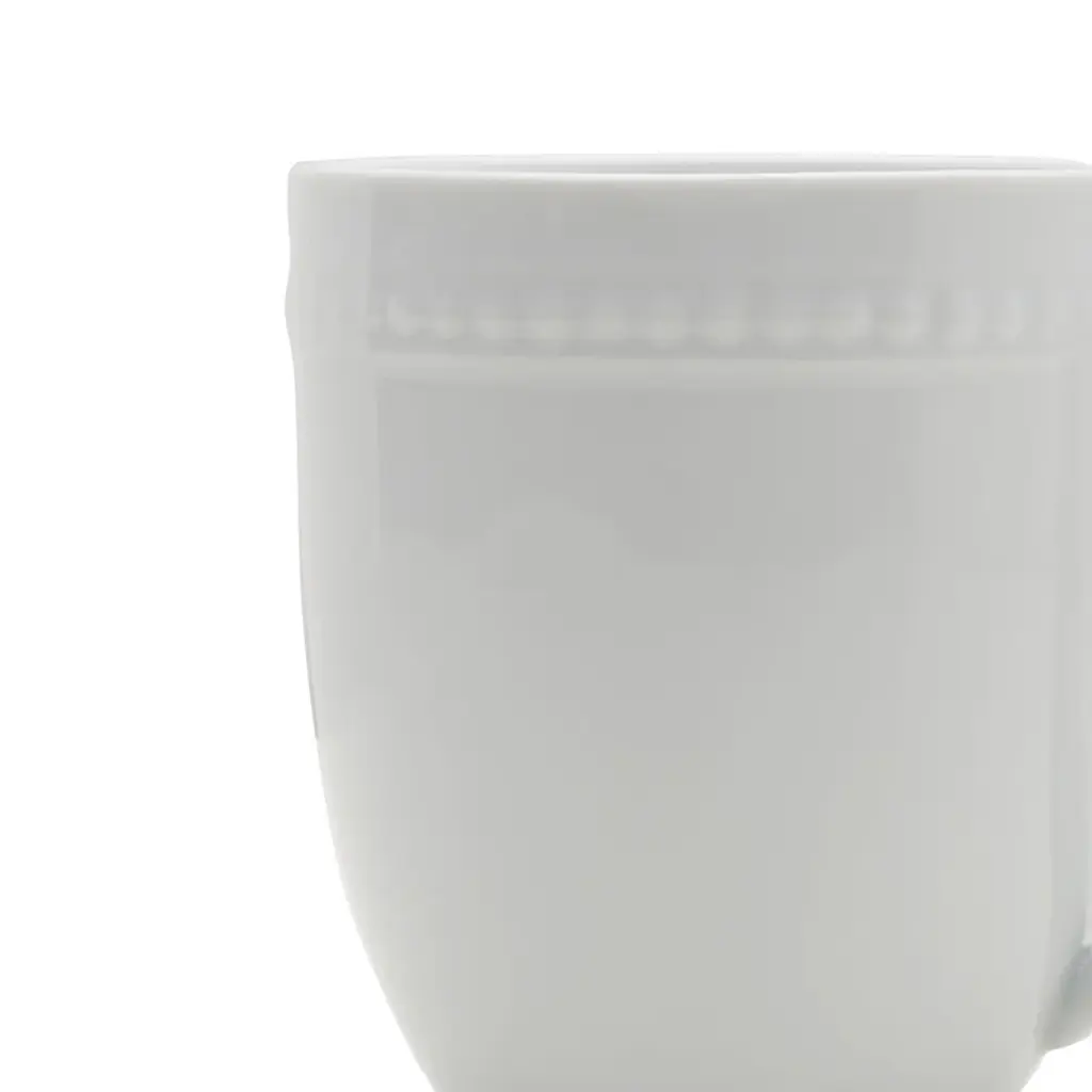 Elegant and understated, this Set of 4 Max beaded mugs by Fitz and Floyd is beautifully crafted of chic white porcelain bordered with a subtle, raised bead pattern. Perfect for everyday use or formal entertaining and will match any home decor.