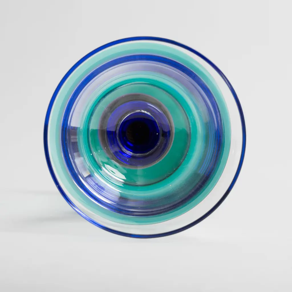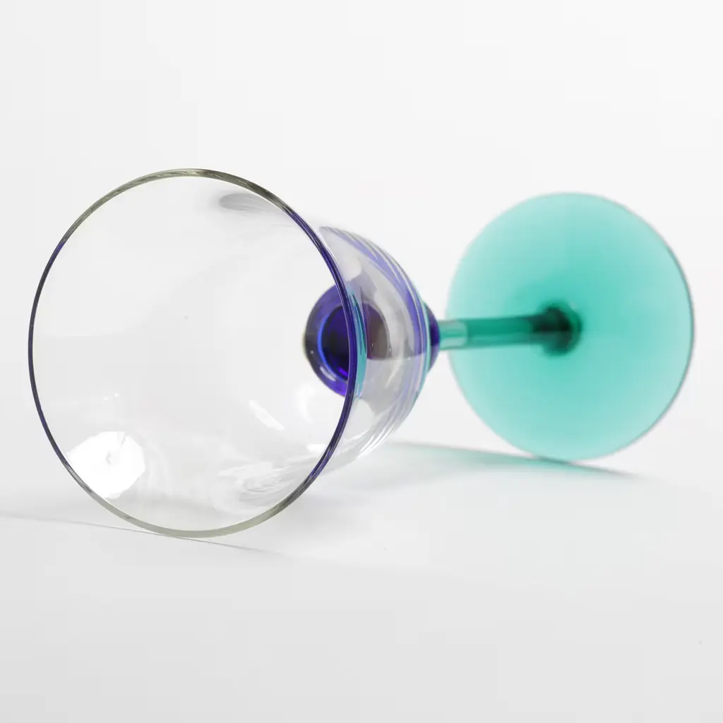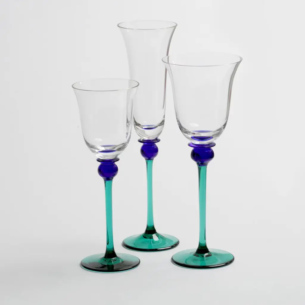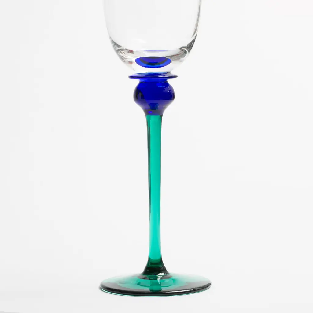 This exquisite set of 3 Glasses for Six and pitcher features elegant lines and vivid colors. The green handle turns blue at its base and the body is in crystal color.