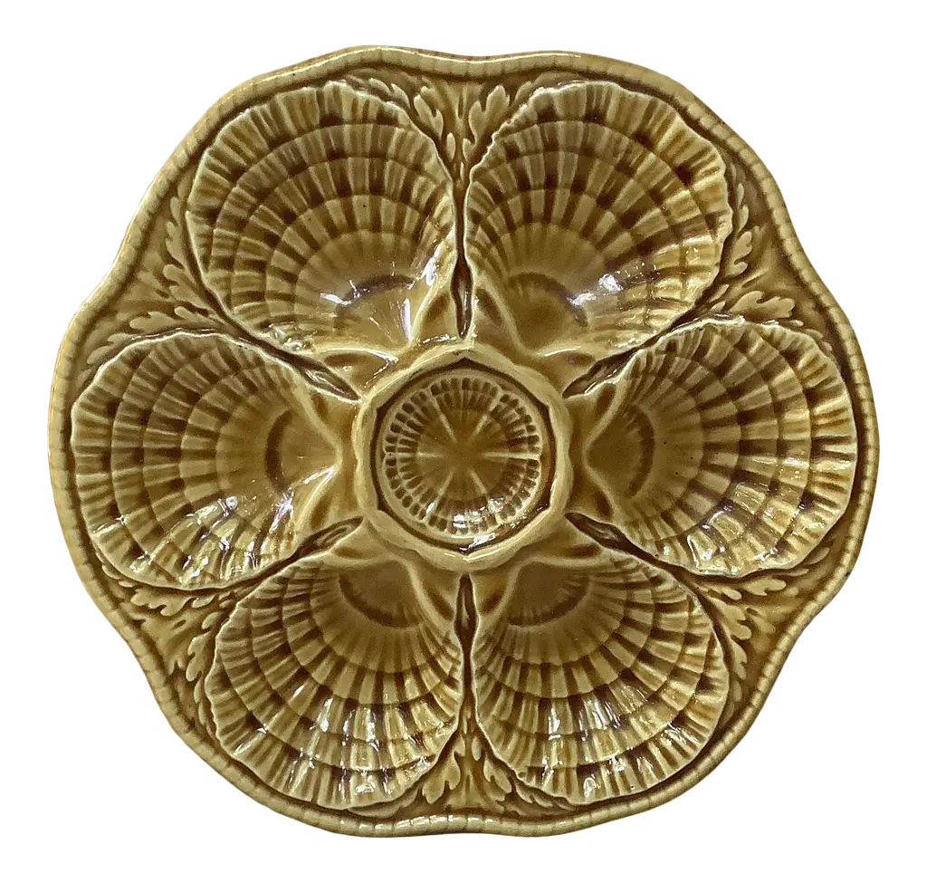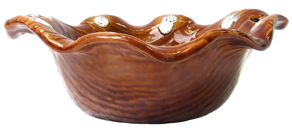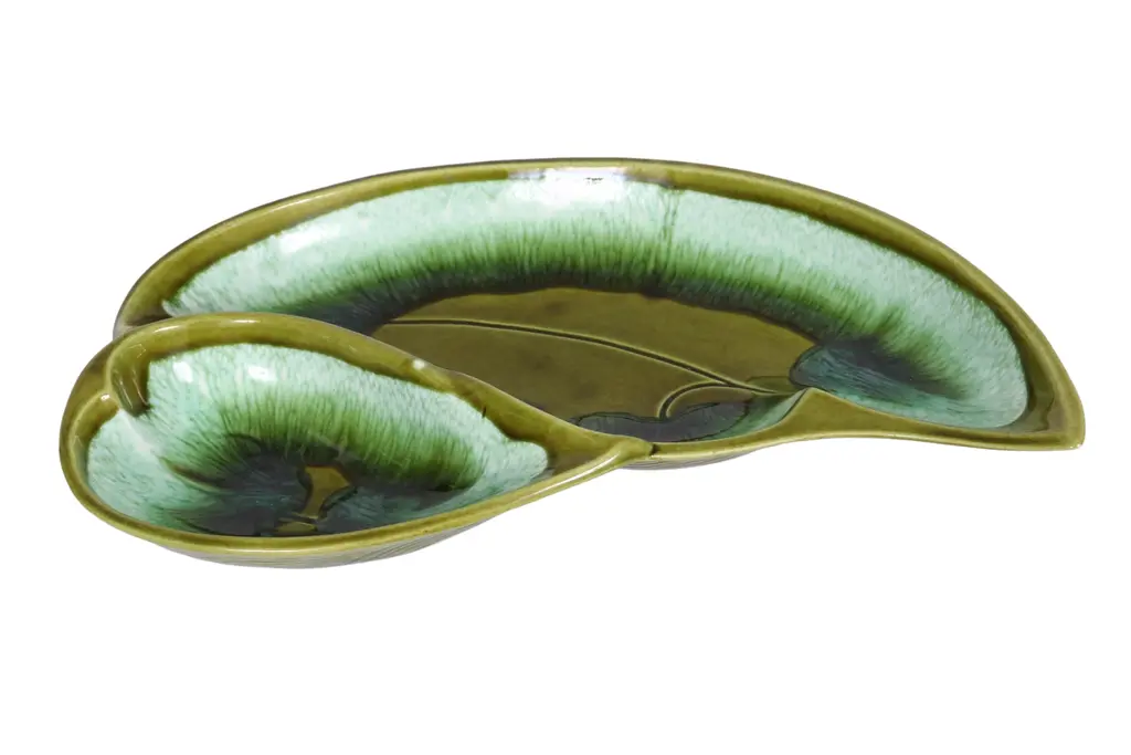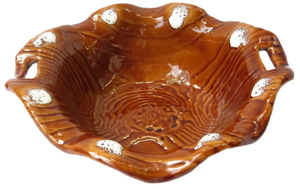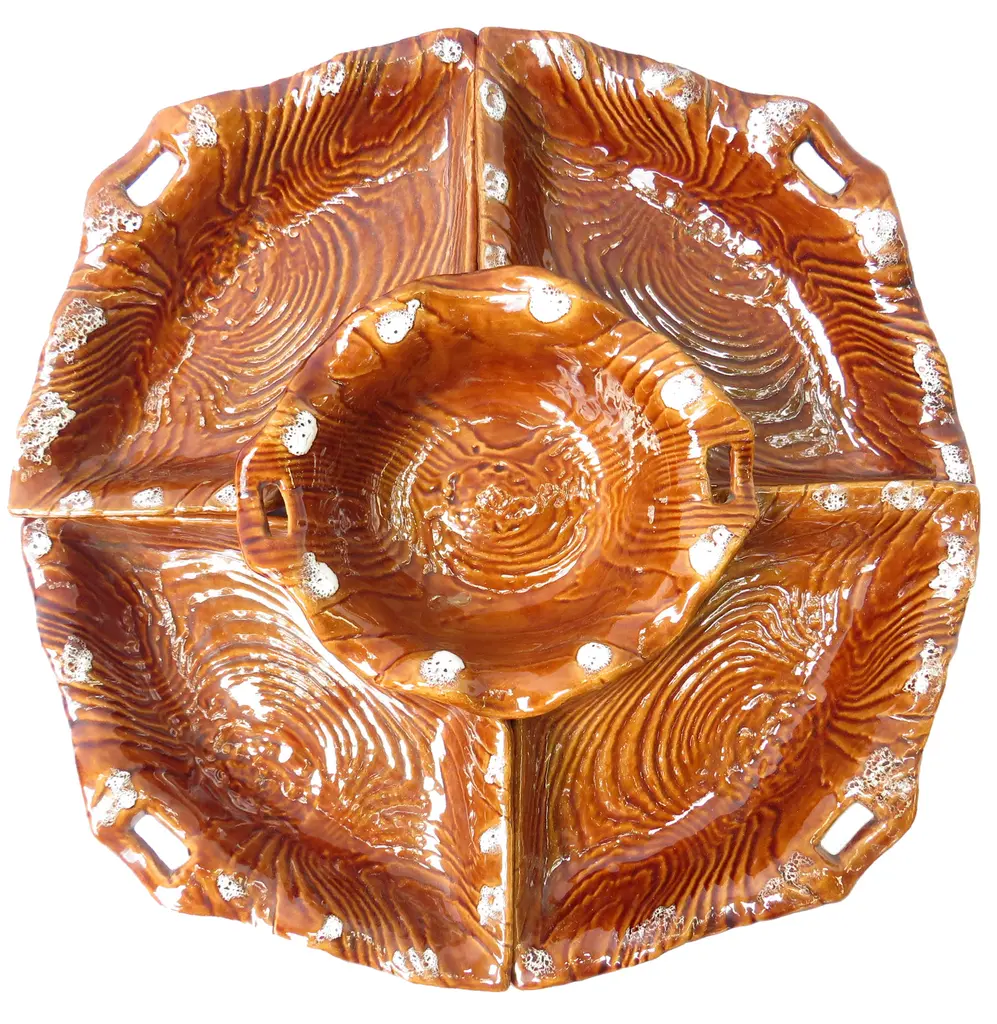Fantastic California Pottery ceramic serving set with an organic chic vibe. Deep center two-handled bowl w/ 4 trays encircling; faux bois texture, and multi-tone drip glaze. Perfect for serving chips and dip, artichokes, crudite, or fruit. Mark: Calif B412 USA dates to early-mid 1900s. Dimensions: overall, 16"Dia., center bowl, 7.25"W x 6.75"D x 3"H"; trays, 10"W x 5.5"D x 2"H. Excellent vintage condition -- no chips, no scratches, no crazing.