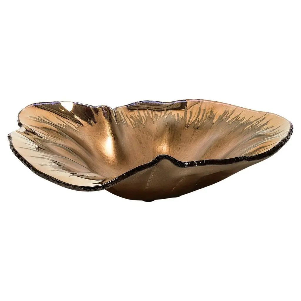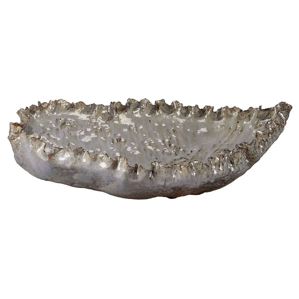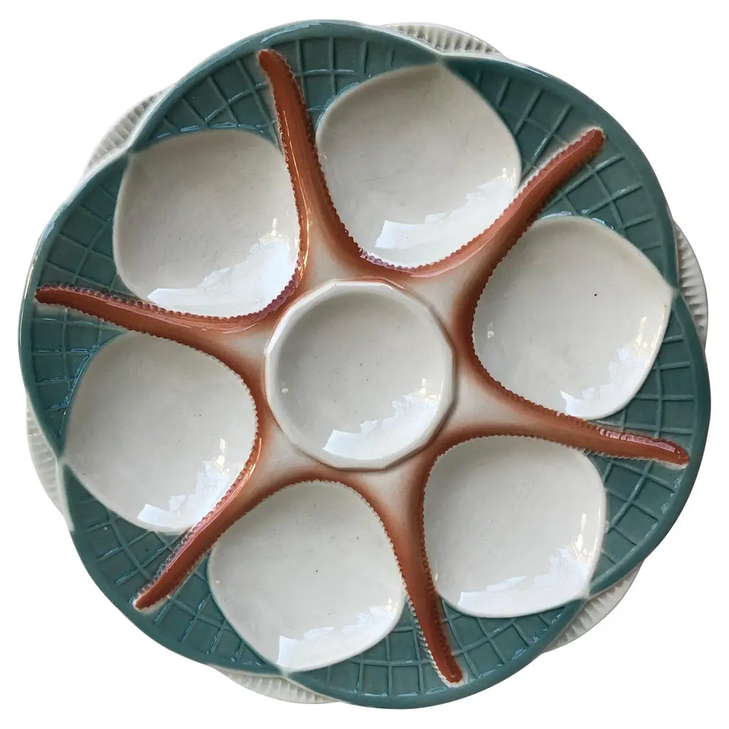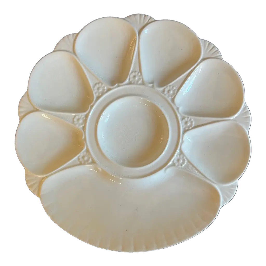 Fantastic California Pottery ceramic serving set with an organic chic vibe. Deep center two-handled bowl w/ 4 trays encircling; faux bois texture, and multi-tone drip glaze. Perfect for serving chips and dip, artichokes, crudite, or fruit. Mark: Calif B412 USA dates to early-mid 1900s. Dimensions: overall, 16"Dia., center bowl, 7.25"W x 6.75"D x 3"H"; trays, 10"W x 5.5"D x 2"H. Excellent vintage condition -- no chips, no scratches, no crazing.