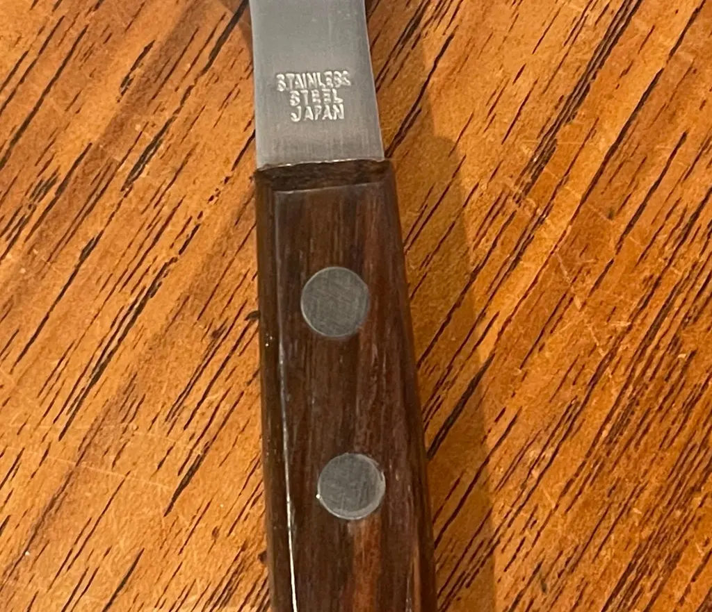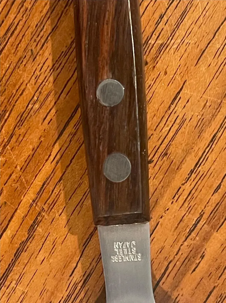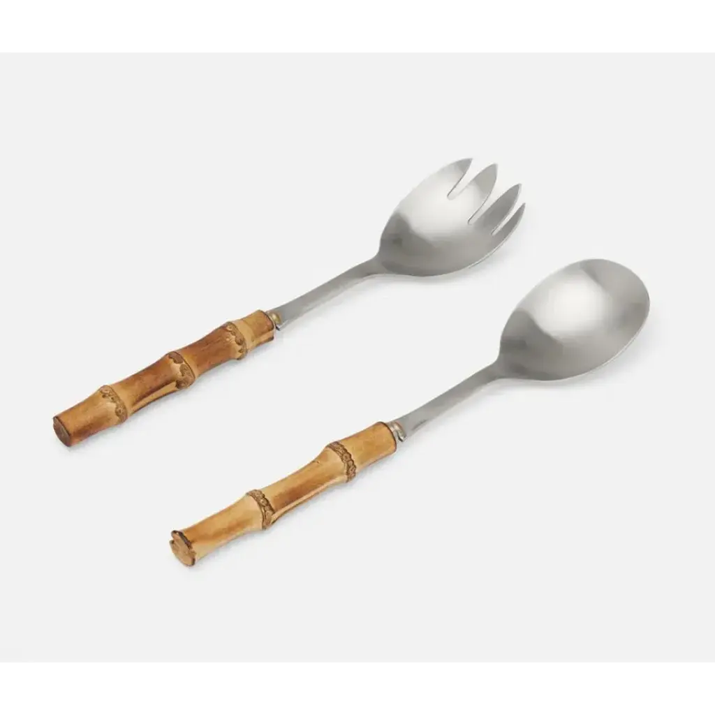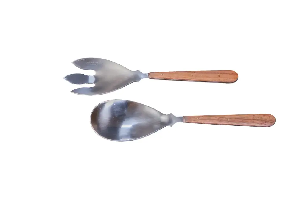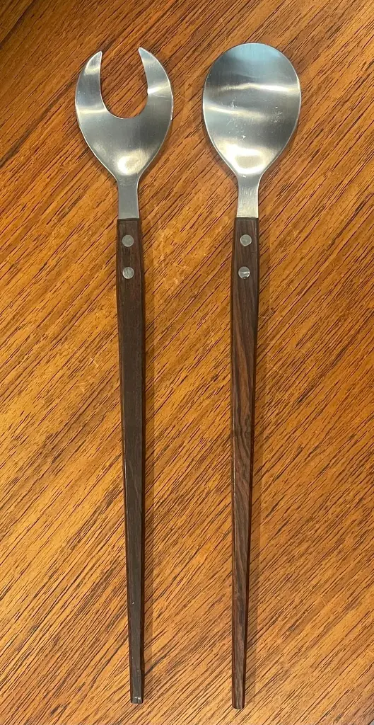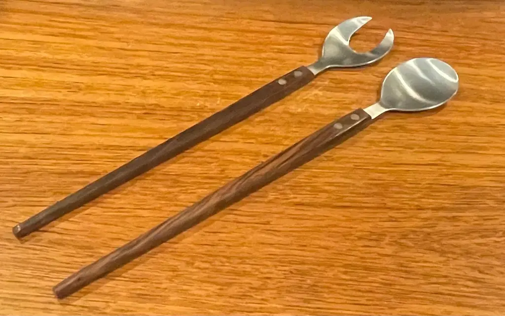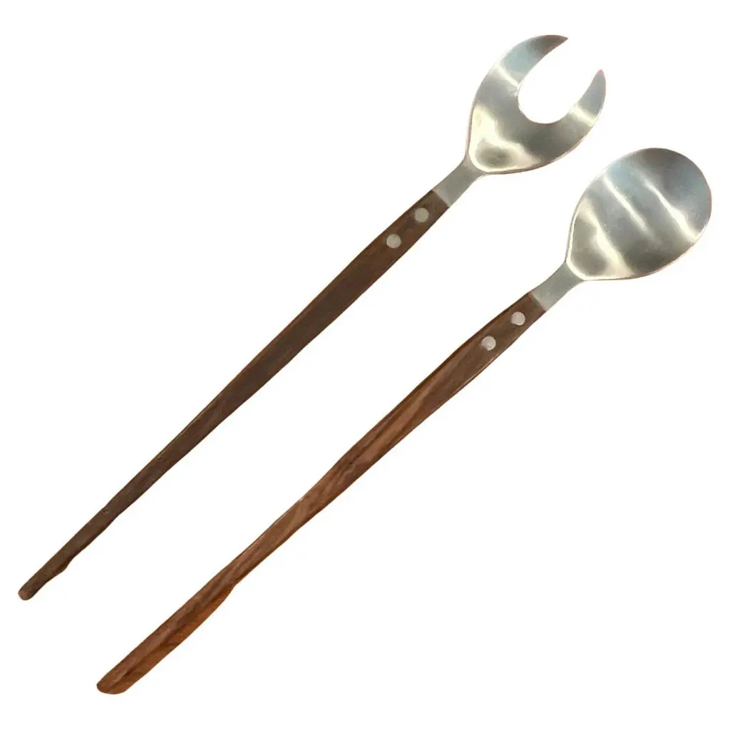 A nice pair of walnut and stainless steel MCM salad servers, circa 1970s. The servers handles are made of solid walnut with the end portions stainless steel. The servers are in very good original condition with some light surface scratches and measure 13"L x 2"W; made in Japan. #2823