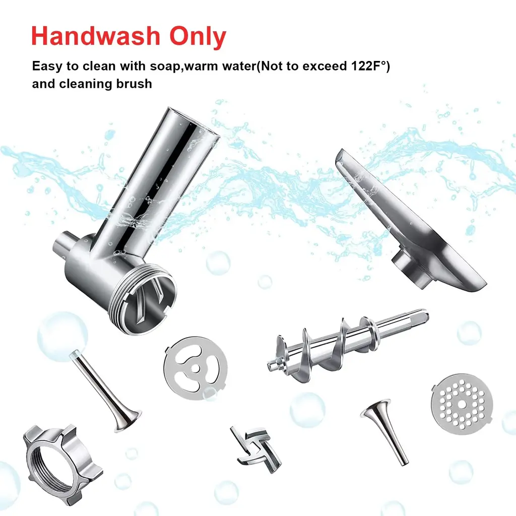 Designed specially for kitchenaid meat grinder attachment, fits all KitchenAid stand mixers, grinding efficiently, grind 3lb raw meat only 1 min. With its fine, medium and coarse cutting blades, you can creat many different textures to your end product. In case of jamming switch off the appliance by pressing the switch, meat will be rotating in the opposite direction, and the head will get empty. Removable aluminium meat tray holds a generous amount of meat to simplify processing, yet all parts are detachable and metal shinning finish, easy clean by hand, recommend cleaning with warm soap water, not dishwasher safe. Always dry them thoroughly after washing for longer service life. Suitable for grinding meat, fruits, vegetable, hard cheeses, bread crumbs and more, create the delicious food in a healthier way, like burgers, savory pizza, sausages, baby food.Feature: Package Include: