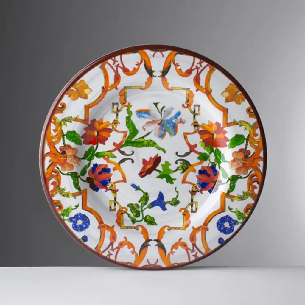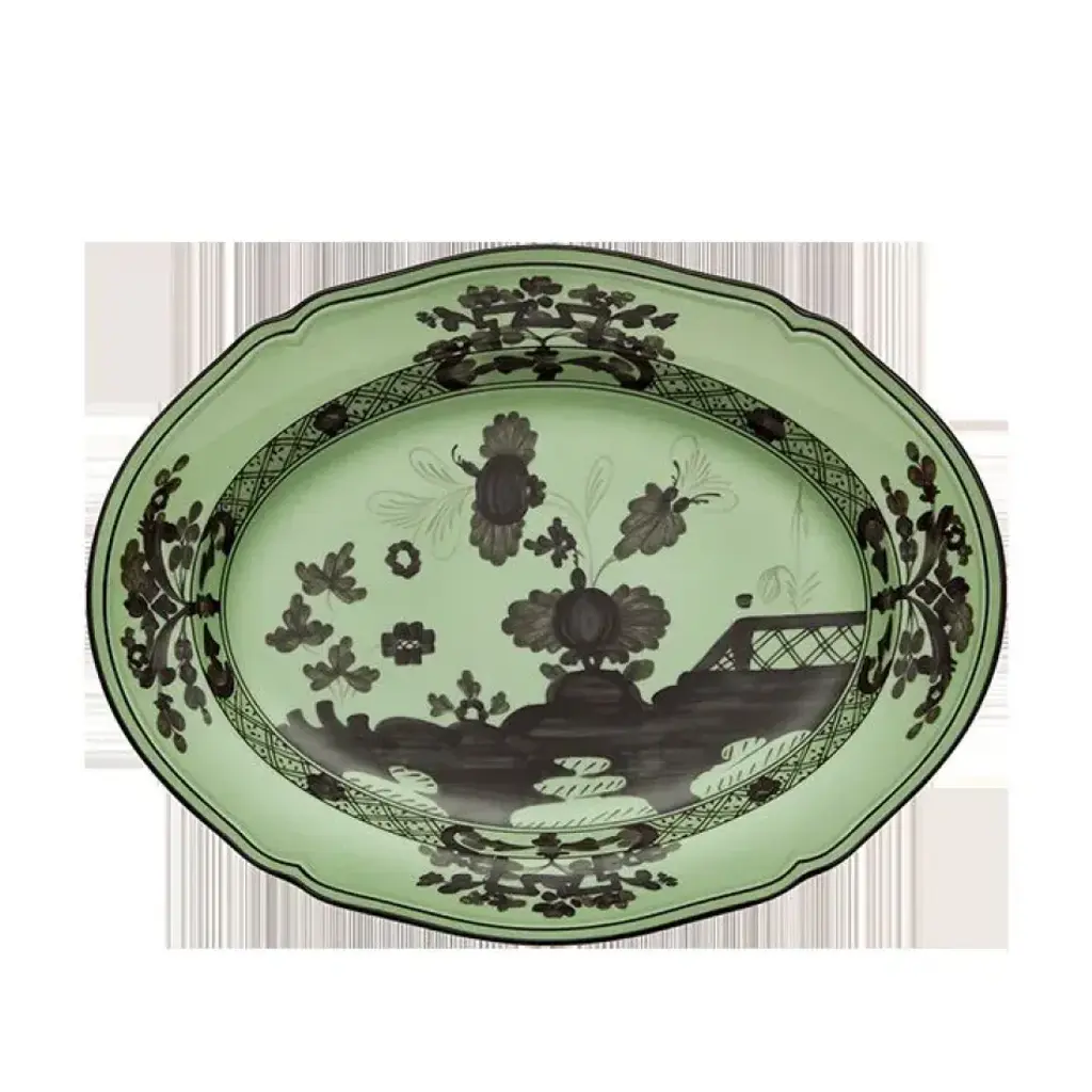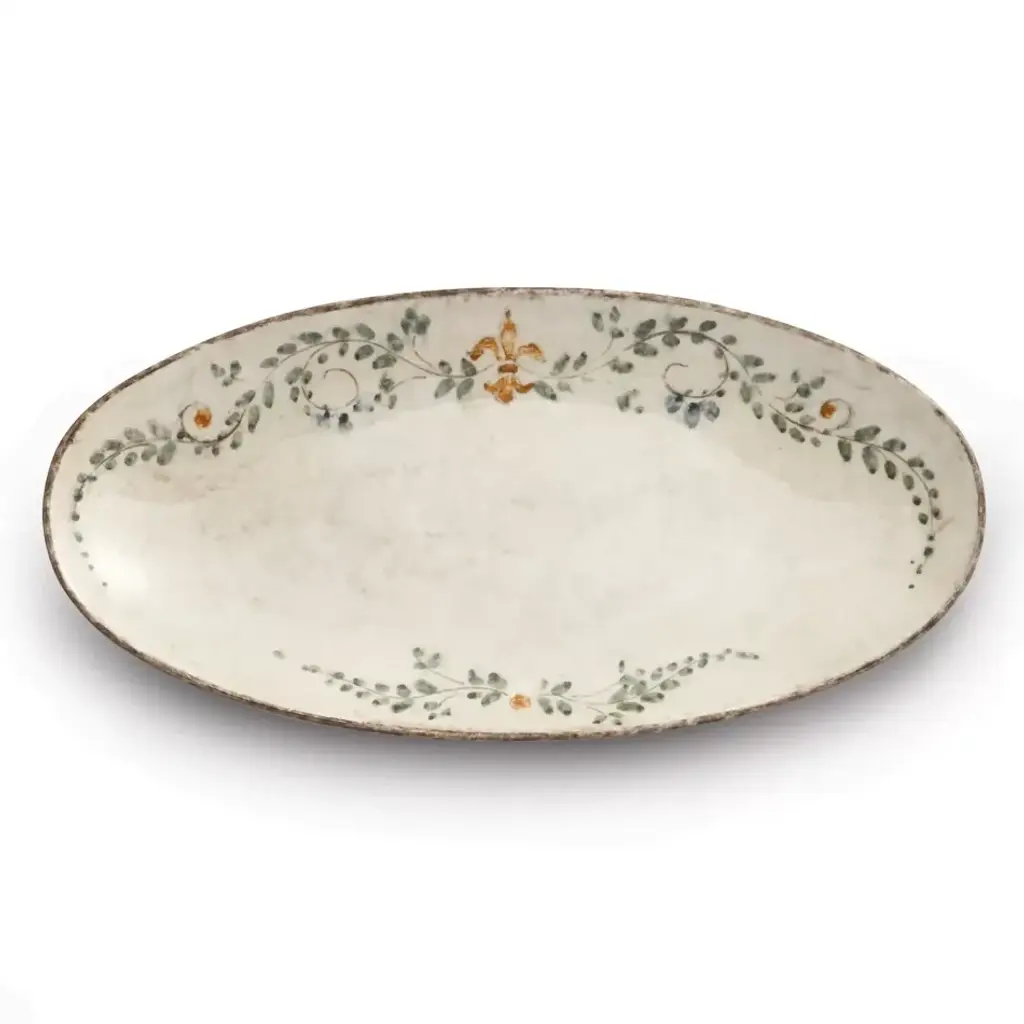 The gentle cream color of this platter is accented with a beautiful, hand-painted giglio (fleur-de-lis) and vine motif in rich hues of green, blue and orange. The uneven edges and subtle colors add to the old world look. Italian ceramic, Hand made in Italy.Microwaveable (may get hot) and dishwasher safe on the low heat, air-dry setting. Founded in 1997 by Ann Skidmore, Arte Italica is a story of one woman's passion for Italian history, culture, art, and vintage pewter. Today, Arte Italica is one of the leading importers of European tabletop and home accessories products in the United States. Every piece is handmade and designed so that they can easily be mixed and matched to create a timeless, classic, and effortless look.