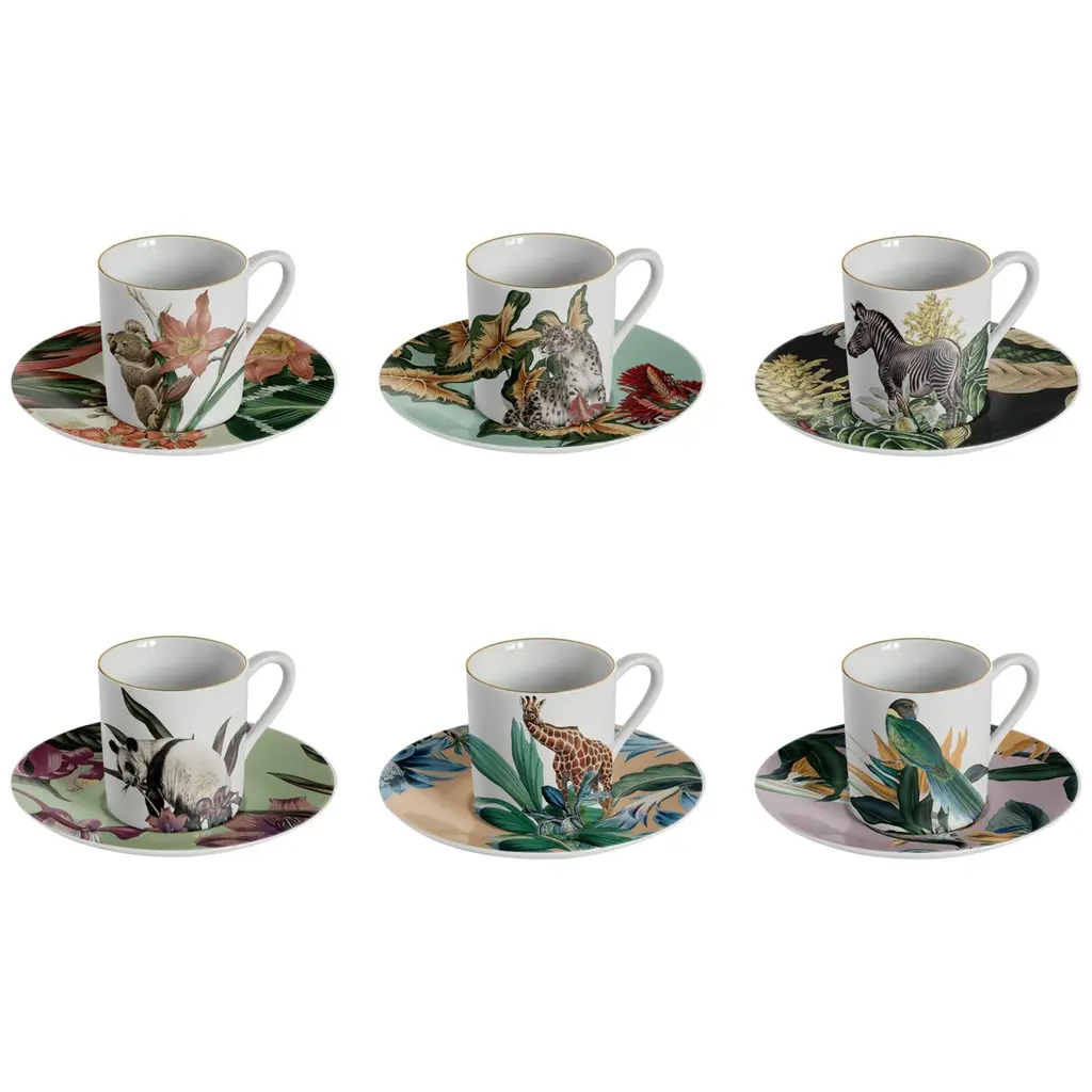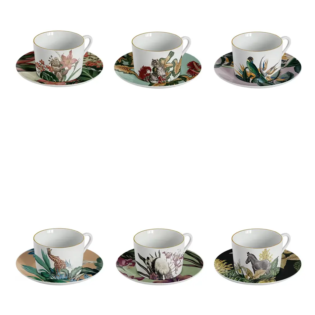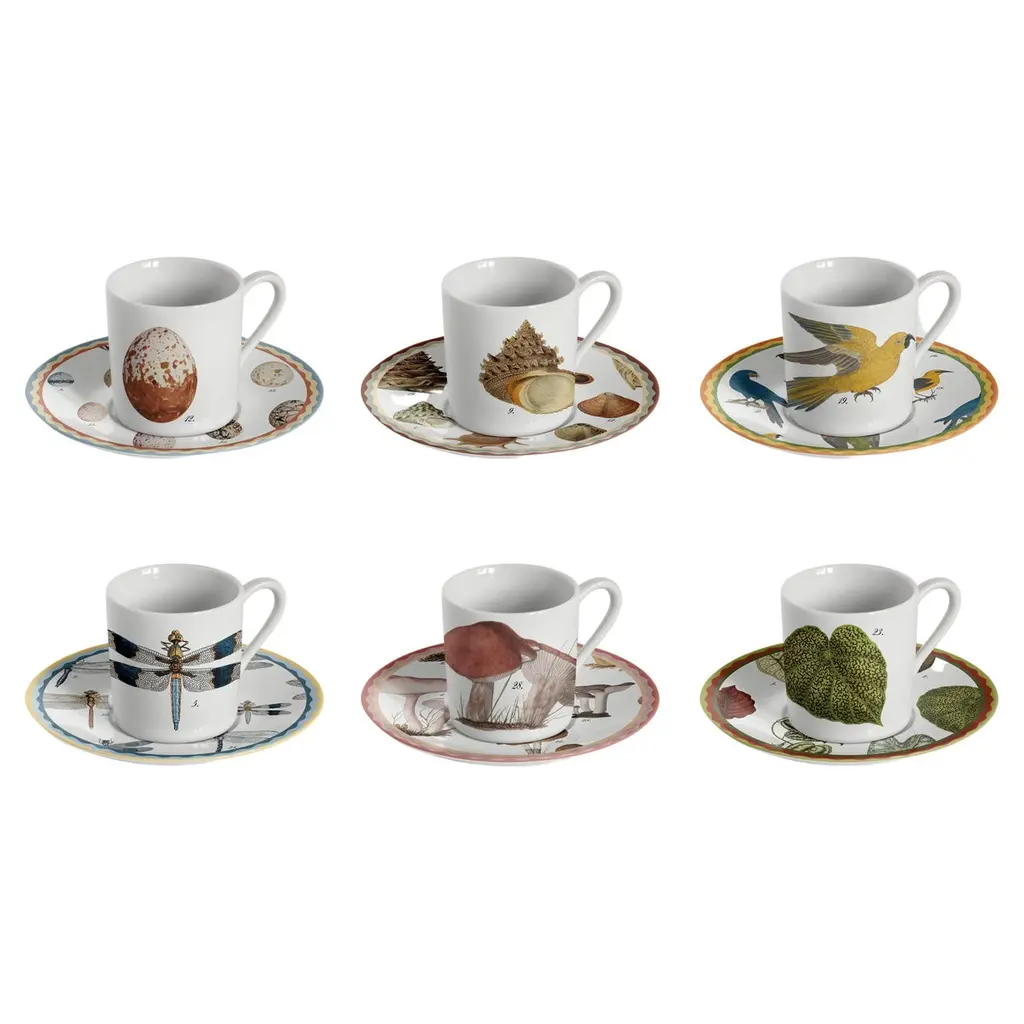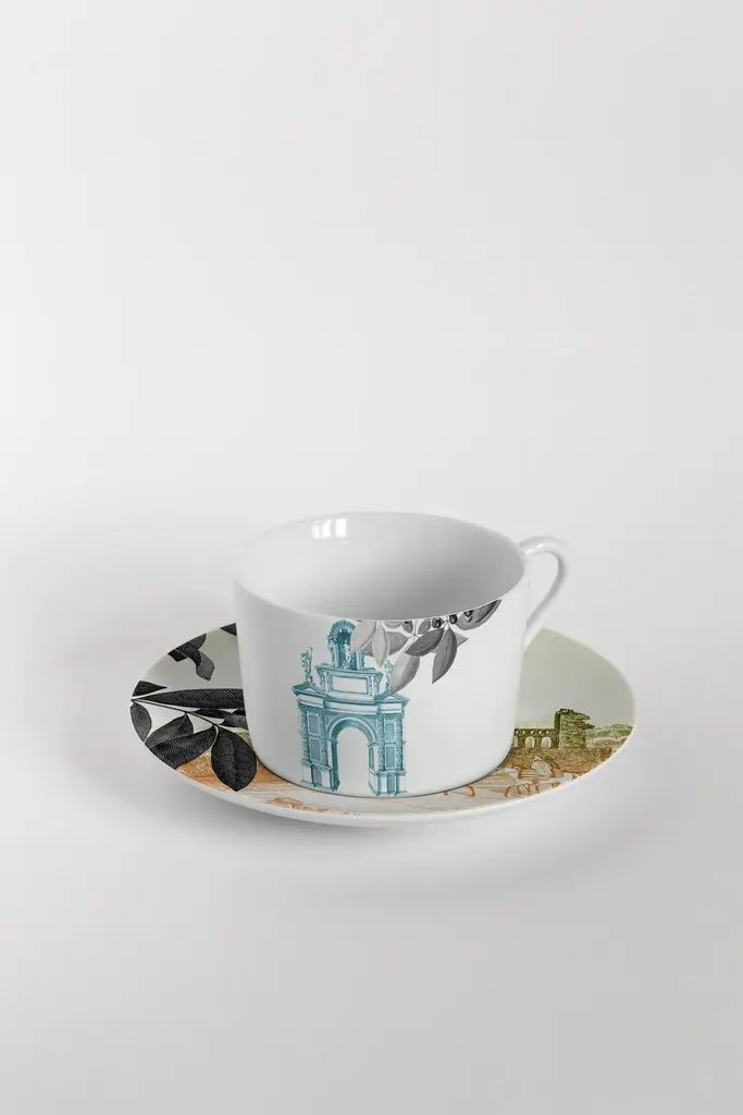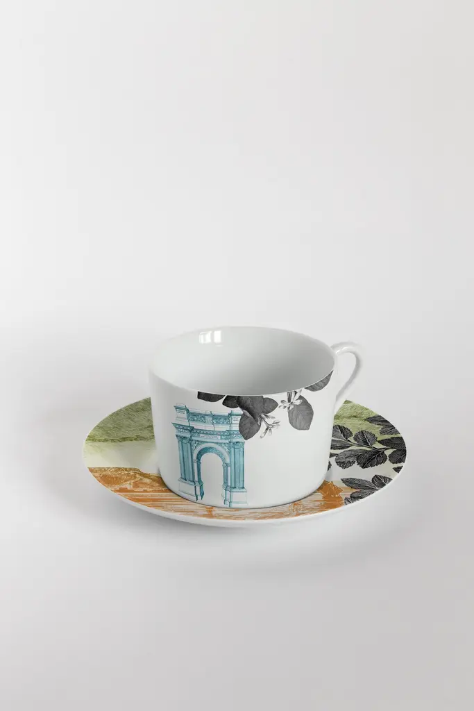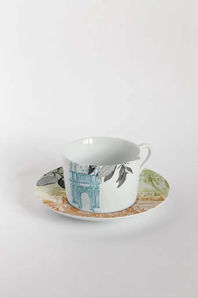 The Mediterraneo collection is the result of Vito Nesta’s reflection on the line between reality and fantasy. The architectures of the doors depicted on the plates arise from technical drawings of monuments never realized but that inspired those that are present today in many Italian cities, from Milan to Rome. The same contrast is present in the setting, the doors portrayed at sunset are in fact surrounded by scenes inspired by colors and scents of North Africa.Tea set with 6 coffee cups and plates.