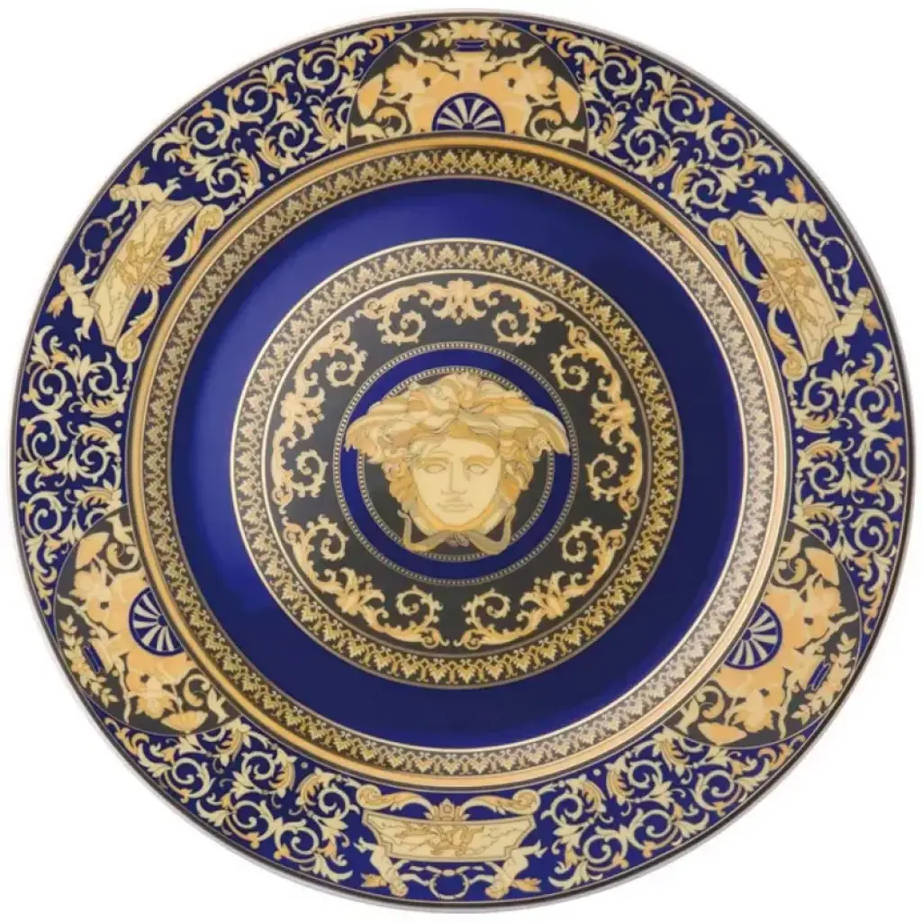 In extravagant blue, gold and black, Medusa Blue is a fascinating collection of pieces featuring the head of Medusa (the emblem of the Versace collection), scroll and acanthus borders, and angels. Please note: Special Order items require an estimated 8-12 weeks for delivery and cannot be canceled or returned.
