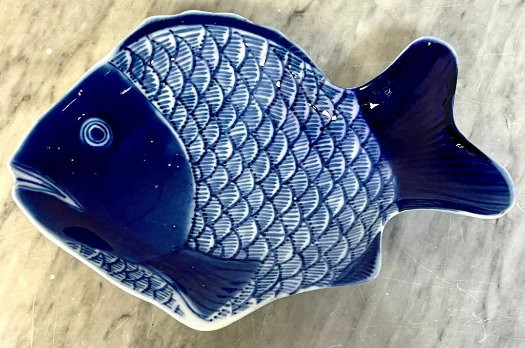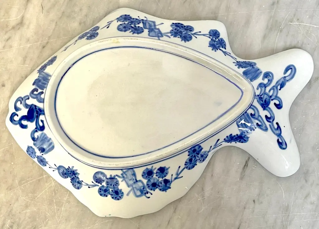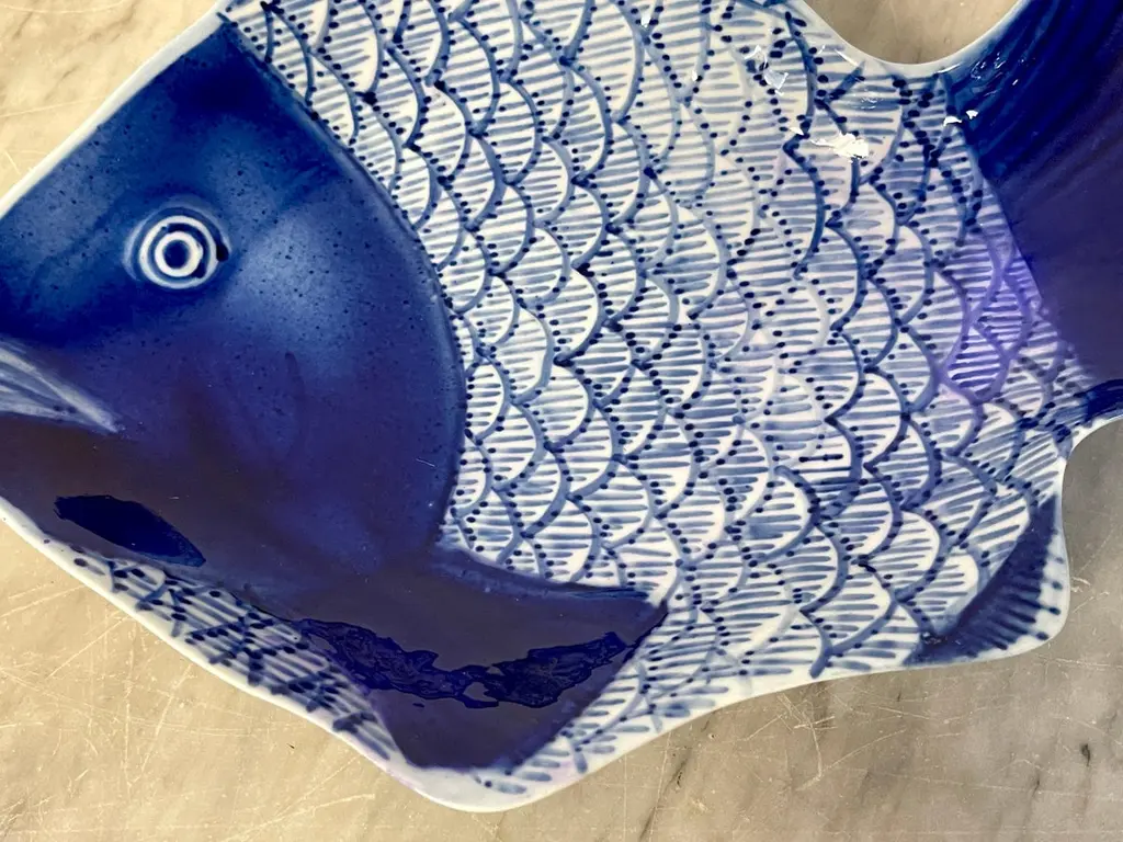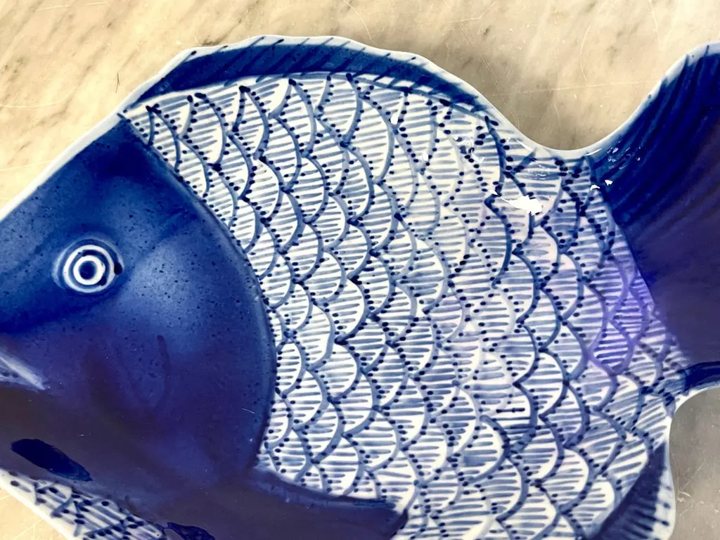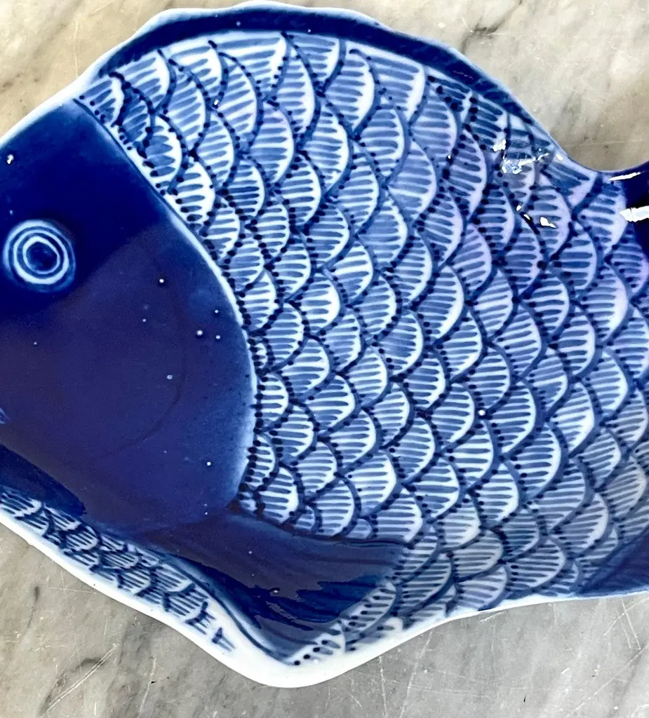 Meiji Period Fukagawa blue & white fish platesJapan Circa 1900sOffering two similar Fukagawa (Attributed) realistically decorated by hand-painting and cobalt blue enamel. With decorated backs, Unmarked. Sold individually. The lower plate has some firing marks on the fishes face.