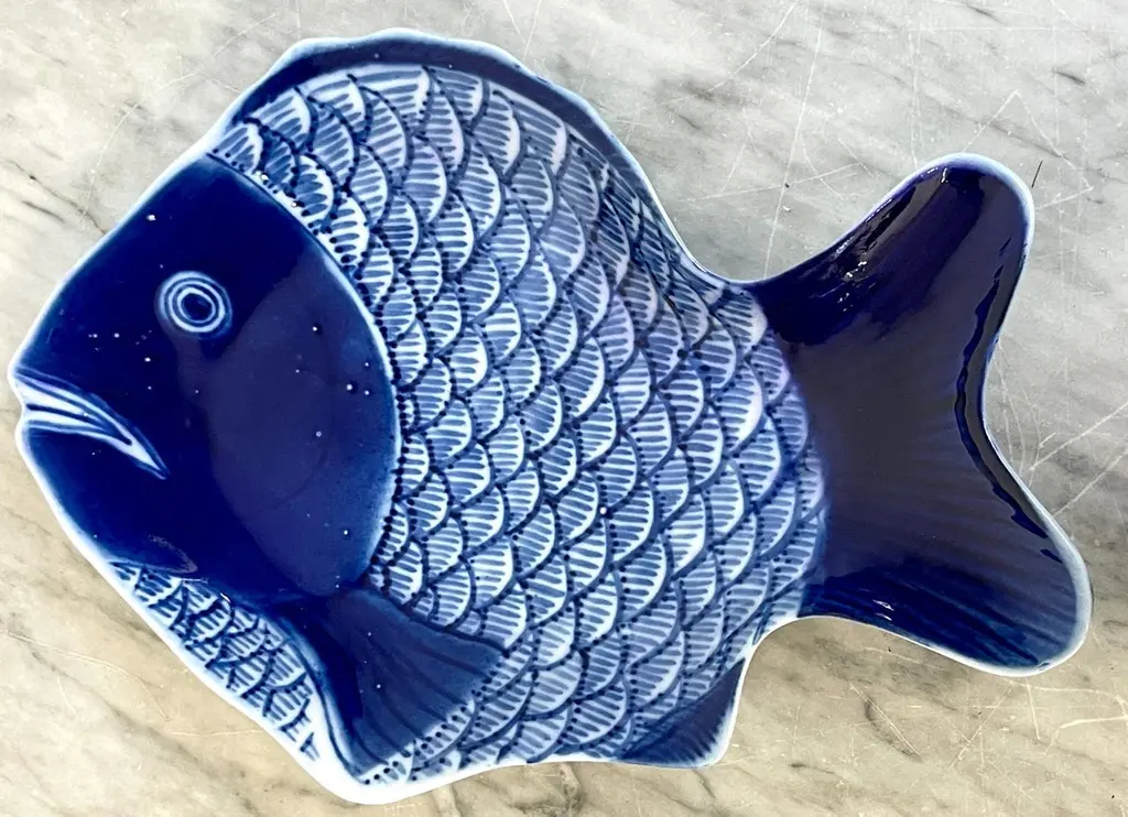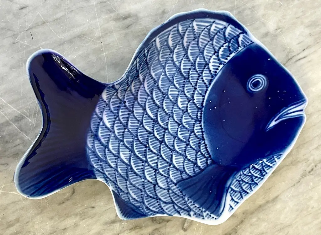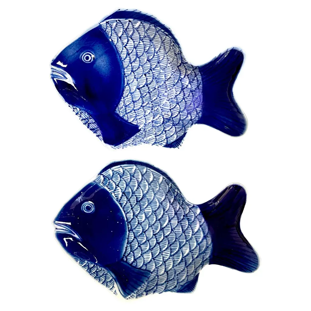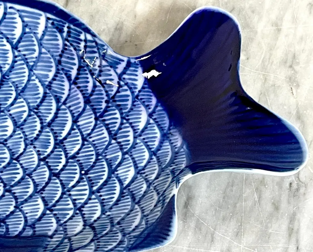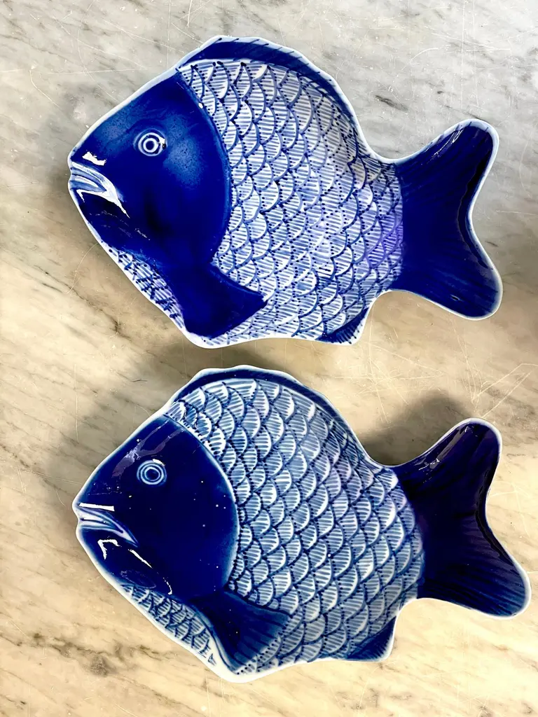 Meiji Period Fukagawa blue & white fish platesJapan Circa 1900sOffering two similar Fukagawa (Attributed) realistically decorated by hand-painting and cobalt blue enamel. With decorated backs, Unmarked. Sold individually. The lower plate has some firing marks on the fishes face.