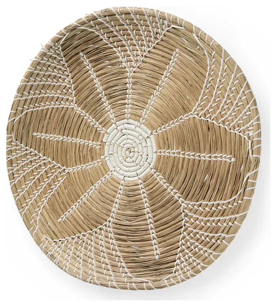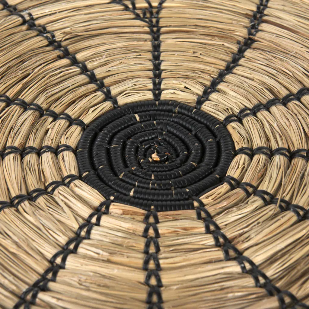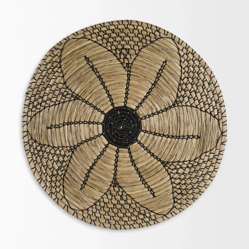 Mekhi is an eclectic decorative wall accent made of light brown seagrass, woven with black string to make a beautiful flower pattern.