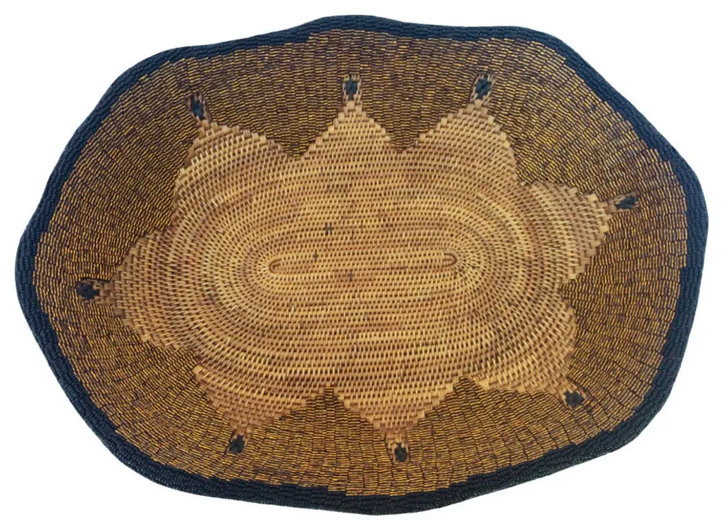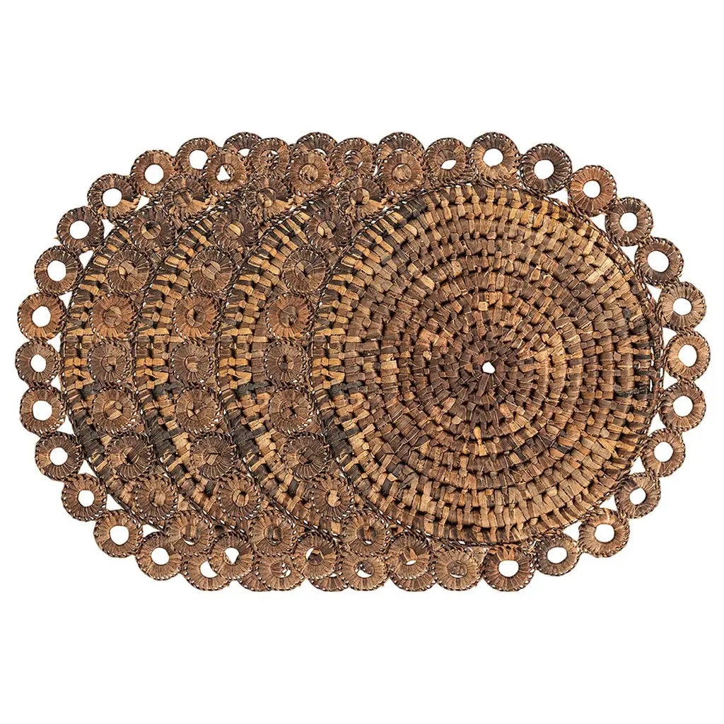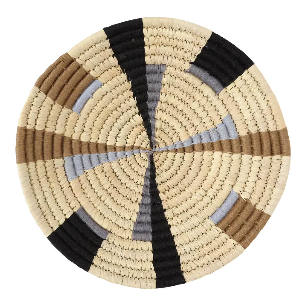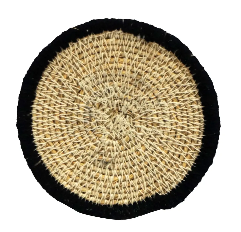 Mekhi is an eclectic decorative wall accent made of light brown seagrass, woven with black string to make a beautiful flower pattern.