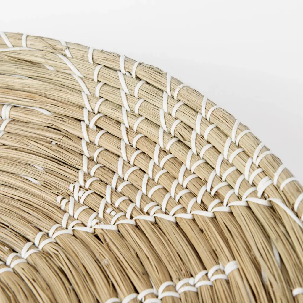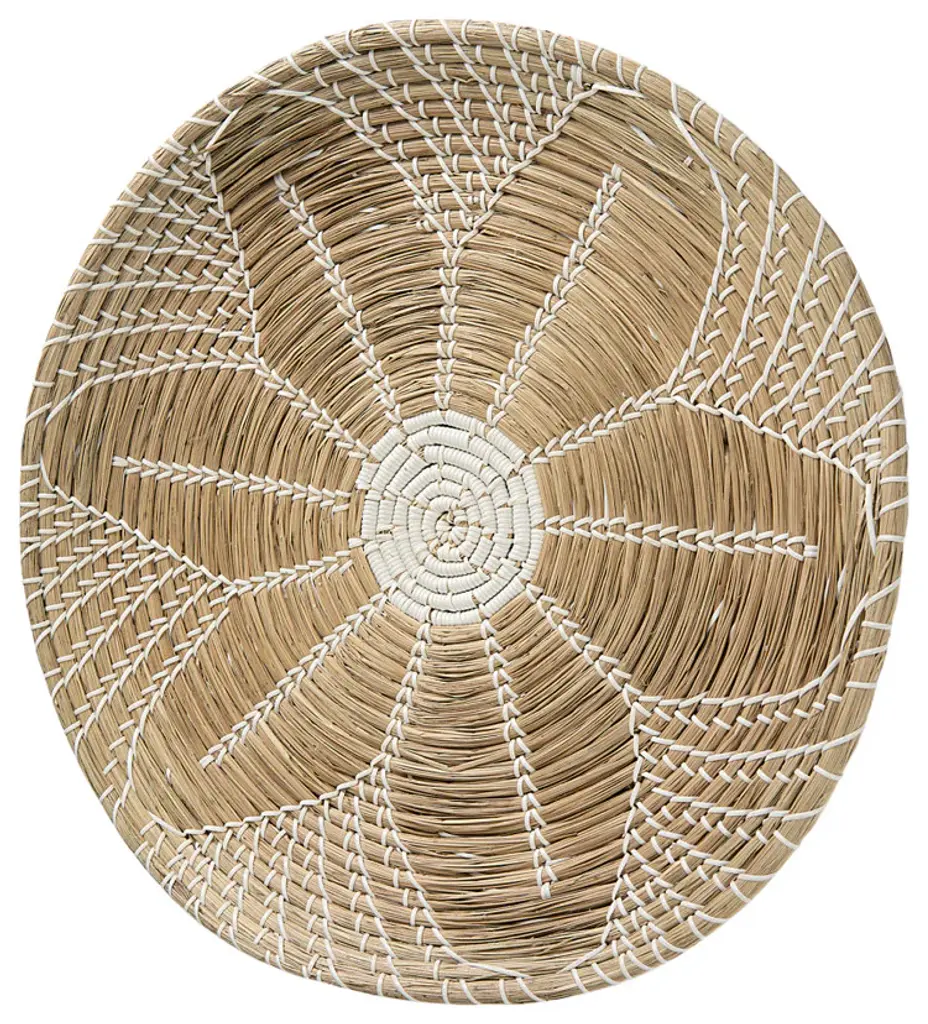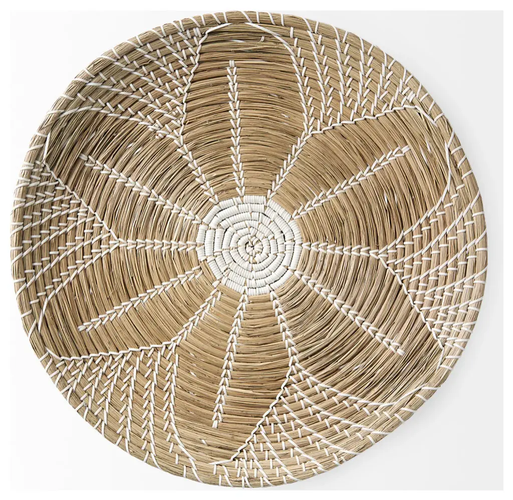 Mekhi is an eclectic decorative wall accent made of light brown seagrass, woven with white string to make a beautiful flower pattern.