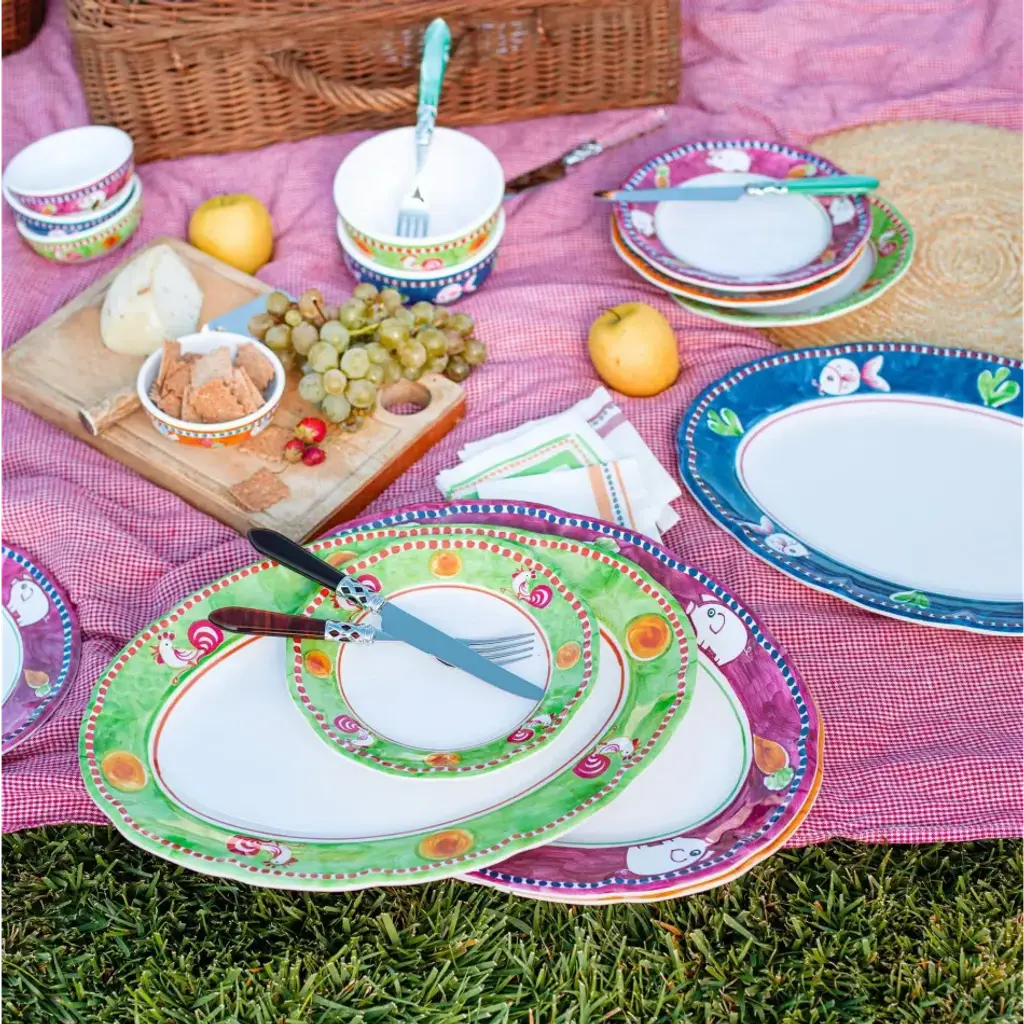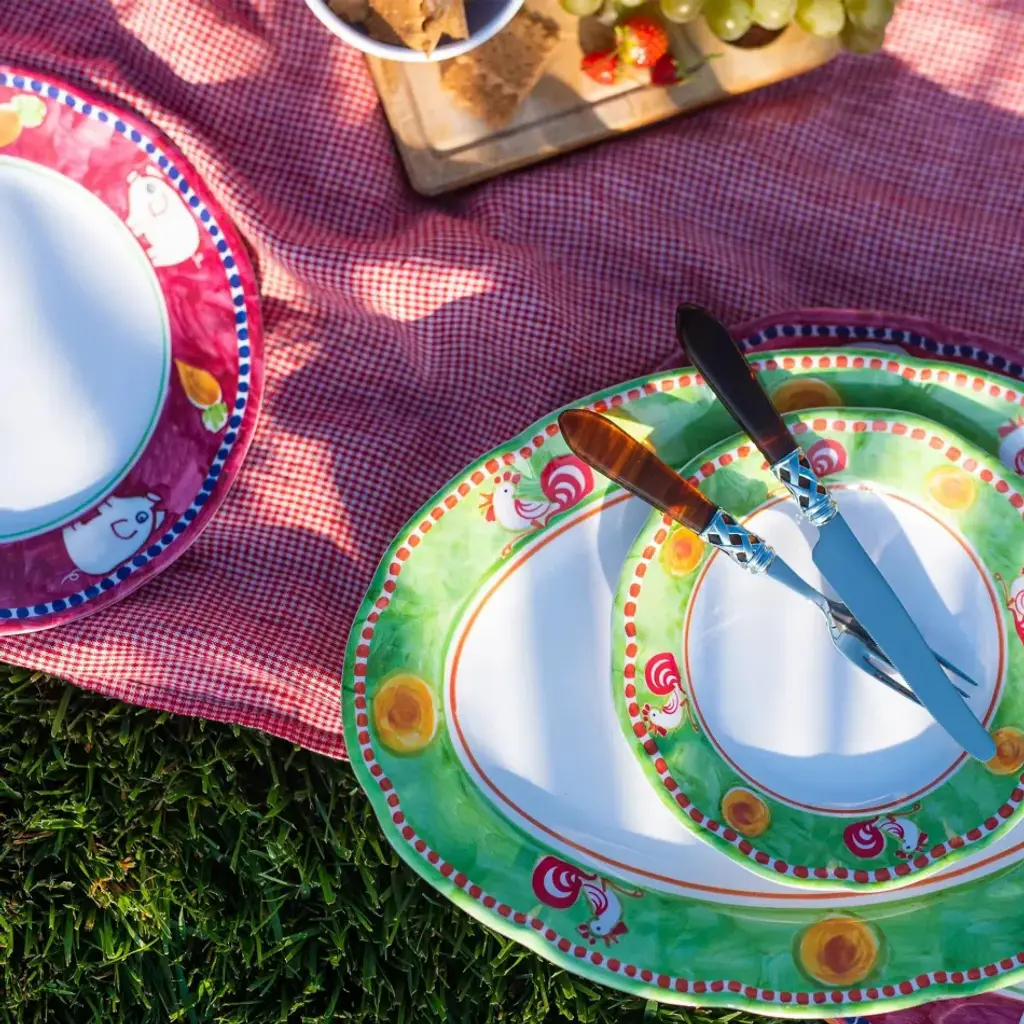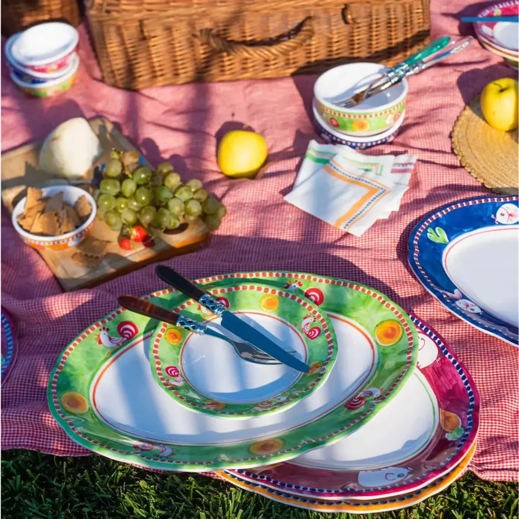 The Melamine Campagna Gallina Oval Platter features plucky, handpainted roosters on a soft green background, and its durable material makes it a perfect serving piece for outdoor gatherings. Since 1983, Vietri has specialized exclusively in Italian handcrafted ceramics, stainless and pewter flatware, mouth blown glassware, lamps, urns and planters. Families of artisans with 3 or 4 generations of history create these special pieces using centuries-old techniques. The subtle color from a paintbrush and the curving stroke of the artist's hand are never repeated in quite the same way, making each piece truly unique.