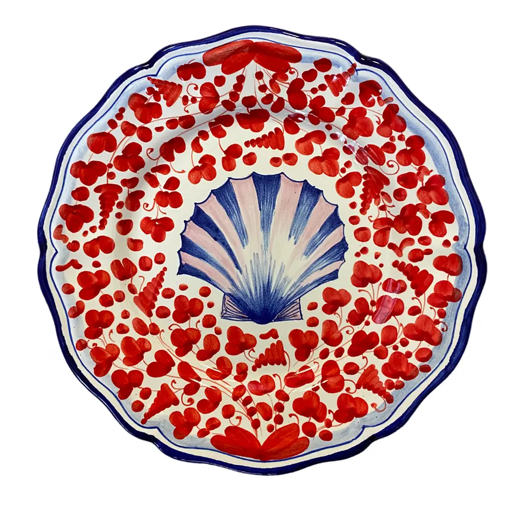 The Menagerie D'été hand-painted lobster ceramic plate features a vibrant red lobster at its center, with delicate marine details in blue around the edge. This design adds a lively, coastal touch to the table, bringing a playful yet elegant flair to any setting.