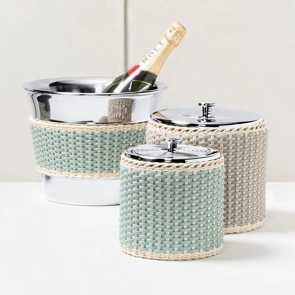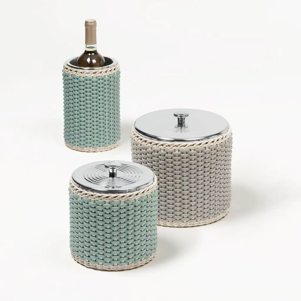 Superbly upholstered in a hand-woven natural rattan and green Napa leather cover, this small ice bucket will make a refined and essential addition to any traditional or modern kitchenware collection. Fashioned of stainless steel, its cylindrical silhouette features an inner double-walled and insulated structure, and is completed with a practical lid with knob.
