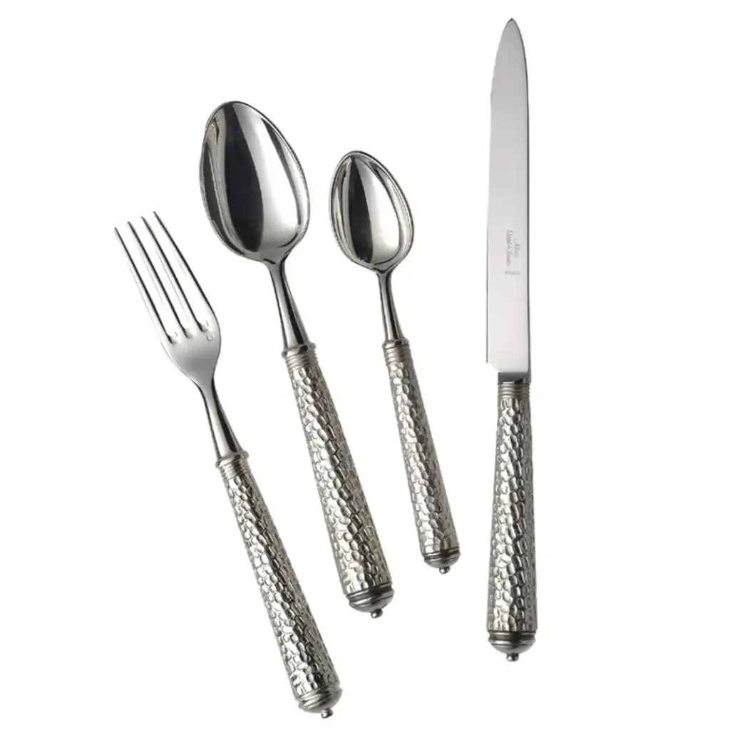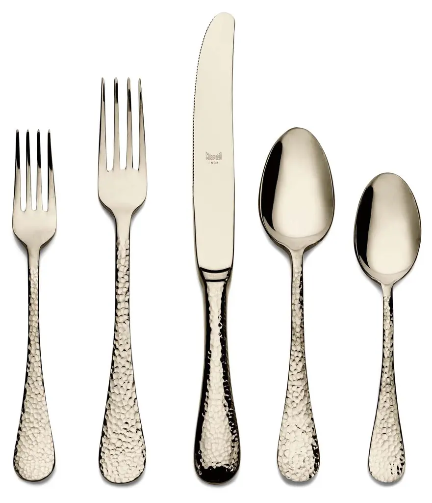 To craft the Mepra Epoque Flatware, artisans in Italy hand hammer pieces of copper to create just the right surface texture which is then transferred to a mold. Thick stainless steel makes this set durable, and the knives are double serrated for long-lasting sharpness. Elegant and ergonomic, this flatware is designed to enhance your dining experience.