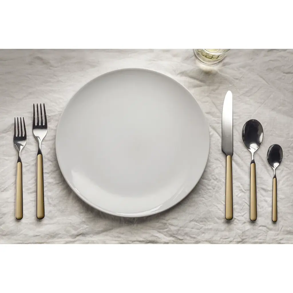 This five-piece flatware set features handles in a variety of vivid hues, bringing a bright, playful look to your dining table. It includes two forks, a knife, and a pair of spoons, all crafted from rust-resistant stainless steel in a polished finish. Mix + match sets in a few complementary colors to curate your own custom tablescape.