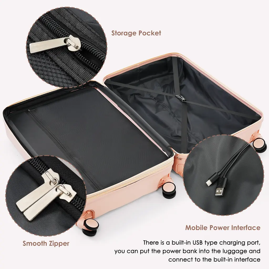 Merax Suitcases 3 Piece Abs Hardshell Front-Opening Luggage Sets With Usb Port And Spinner Wheels & Cup Holder, For Men Women - Pink