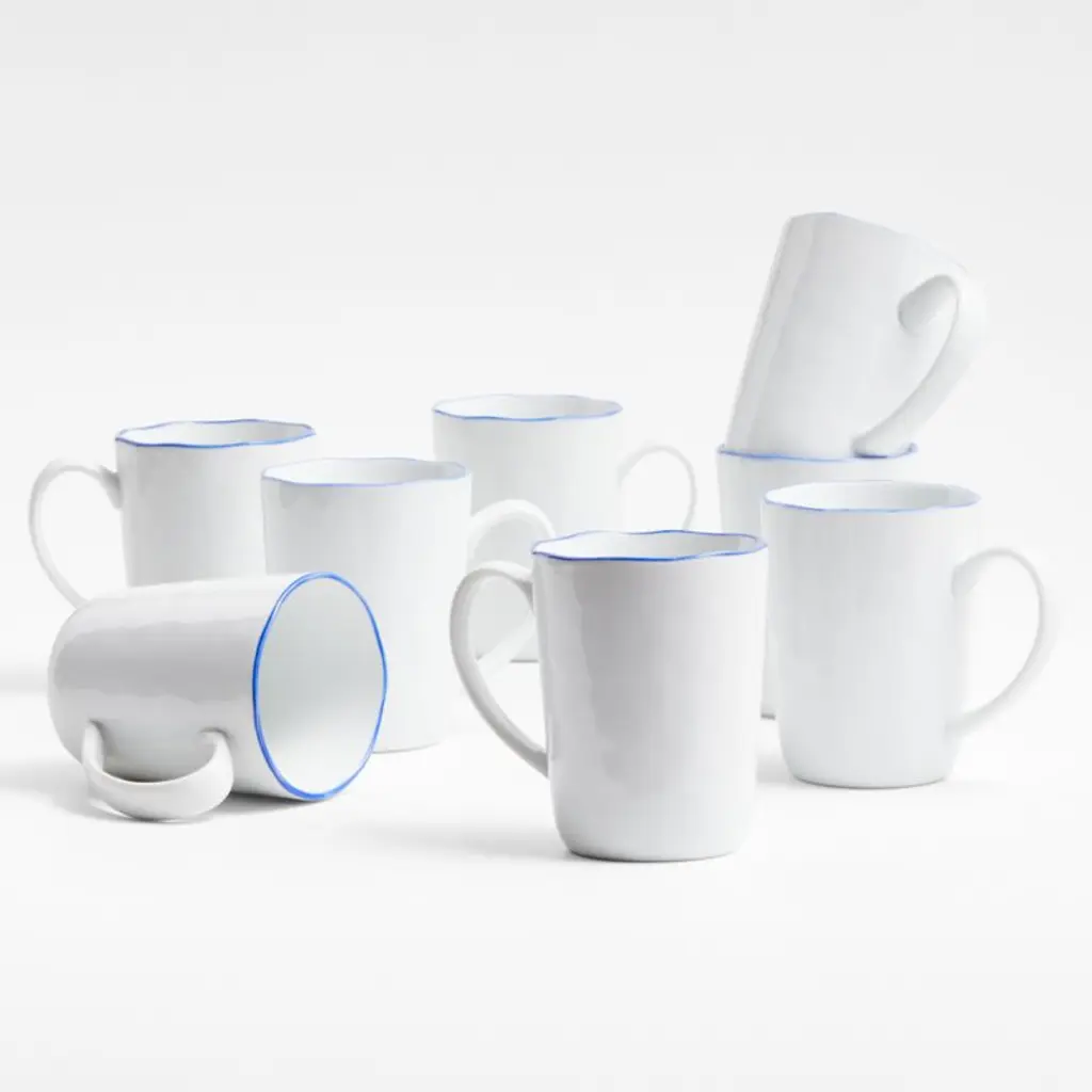 Outlined in blue, our contemporary Mercer porcelain whiteware represents a fusion of refinement and rusticity. This mug takes on organic overtones with a freeform rim and finely "hammered" surface that ripples the light. Offering crisp contrast to the snow-white glaze, the blue rim brings a classic bistro vibe to low-key breakfasts and styled brunches. Smooth enough to not harm table surfaces, the unglazed ceramic bottom gives each piece an artisanal look.