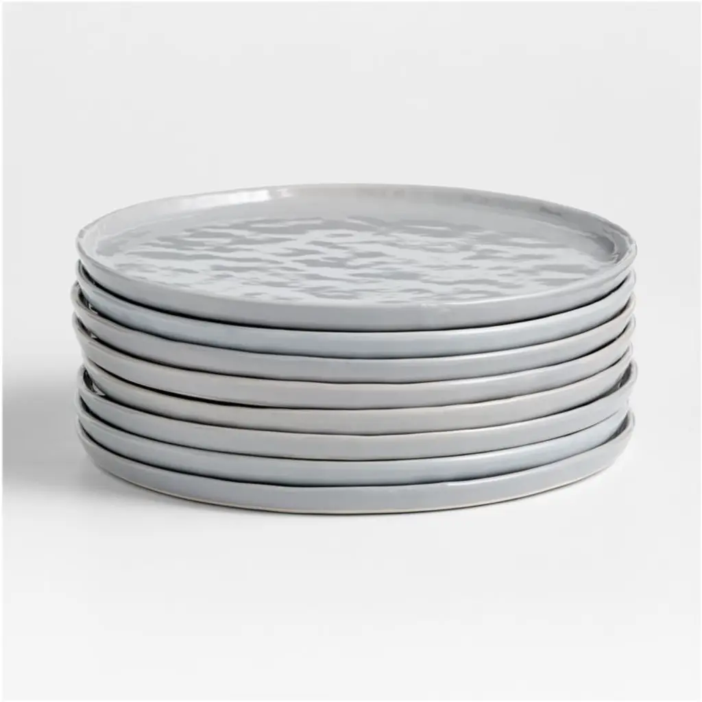 Our contemporary porcelain dinnerware sets a table of refinement and rusticity. Low-profile round dinner plate takes on organic overtones with a freeform rim and a finely "hammered" surface that ripples the light. Made of grey-glazed natural clay, the plate may vary slightly in color. Smooth enough to not harm tables, the unglazed ceramic bottom gives each piece an artisanal look.