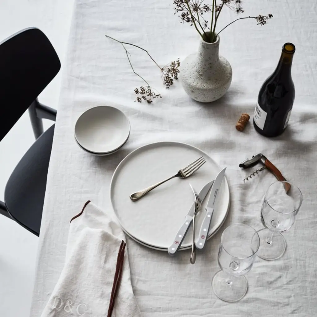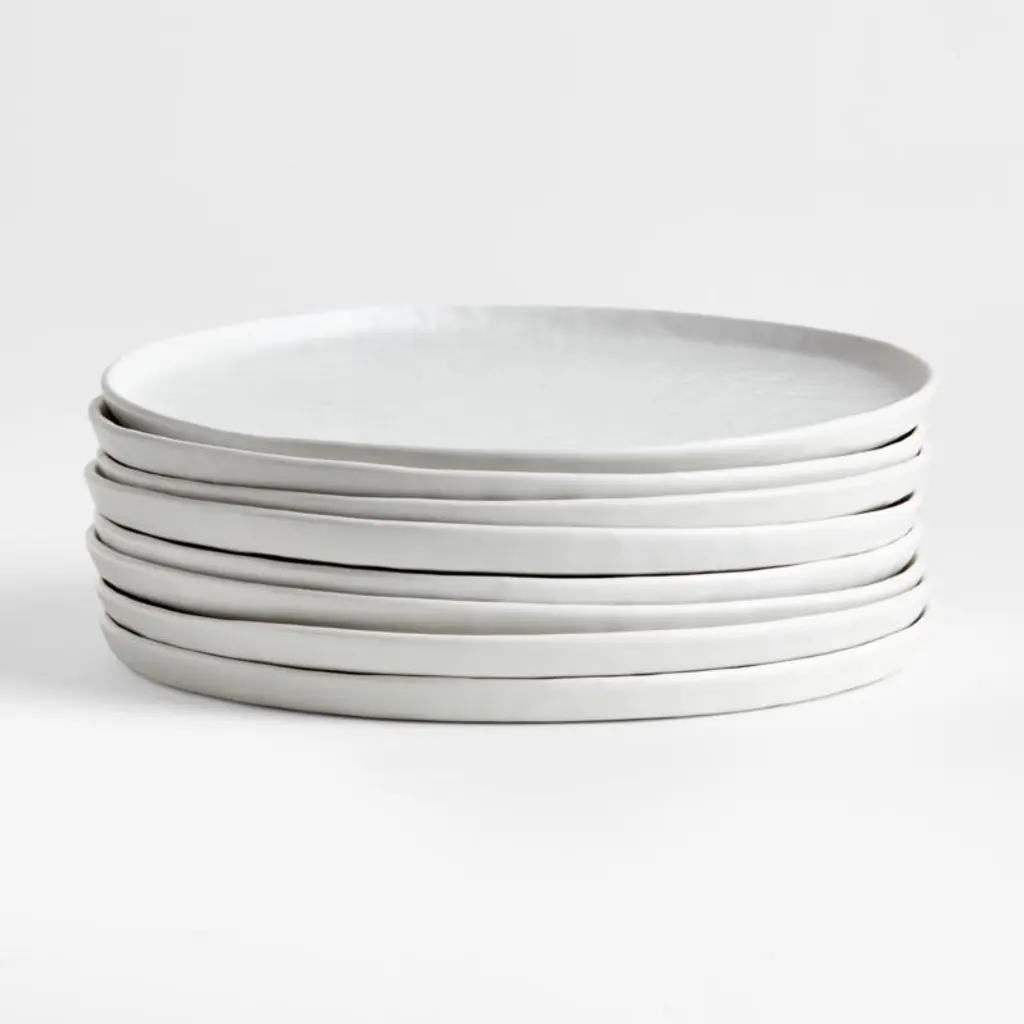 Contemporary porcelain whiteware represents a fusion of refinement and rusticity. The slim profile of this dinner plate takes on organic overtones with a freeform rim, matte white glaze and finely "hammered" surface that subtly ripples the light. Smooth enough to not harm tables, the unglazed ceramic bottom gives each piece an artisanal look.