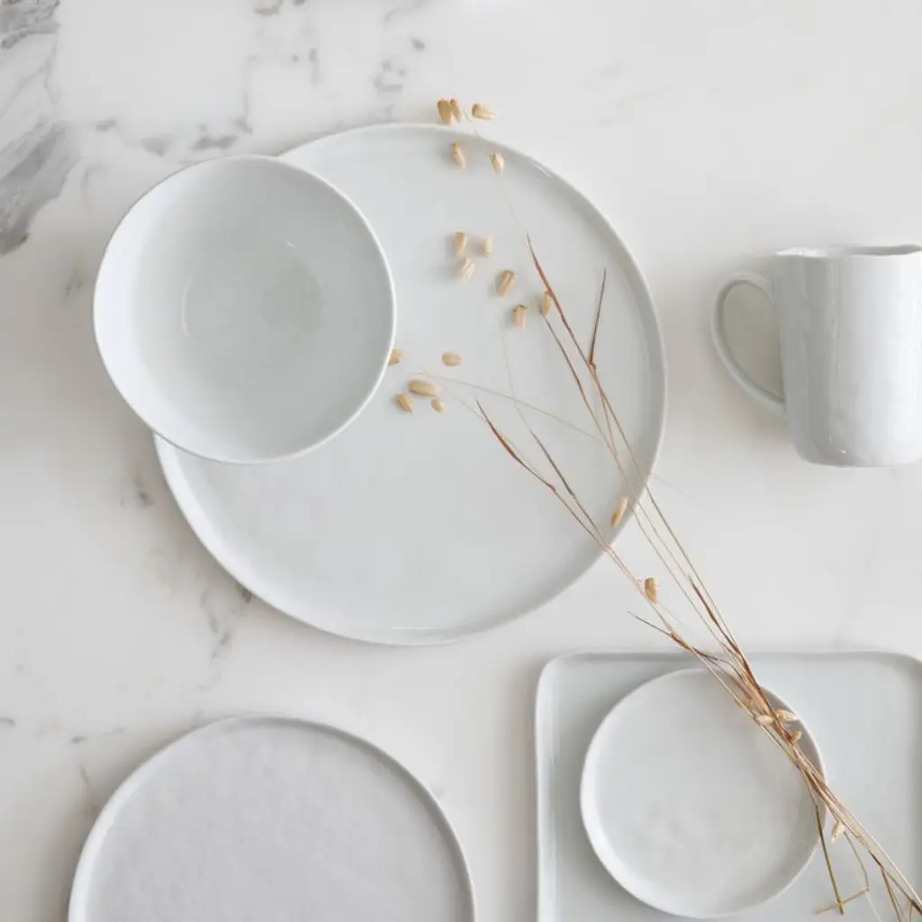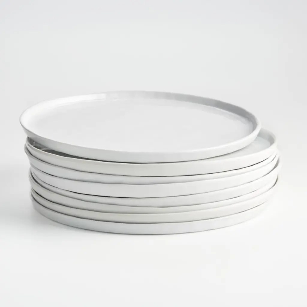 Contemporary porcelain whiteware represents a fusion of refinement and rusticity. The round slim profile of this dinner plate takes on organic overtones with freeform rims and a finely "hammered" surface that ripples the light. Smooth enough to not harm tables, the unglazed ceramic bottom gives each piece an artisanal look.