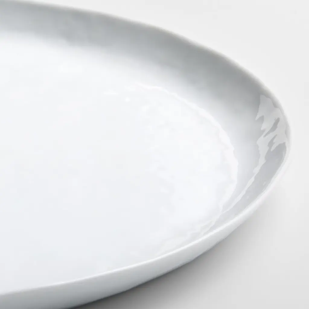 Our contemporary Mercer porcelain serveware represents a fusion of refinement and rusticity. The coupe shape of this round platter takes on organic overtones with a freeform rim and finely "hammered" surface that ripples the light. Smooth enough to not harm table surfaces, the ceramic bottom gives each piece an artisanal look. The serving plate pairs perfectly with our Mercer dinnerware.